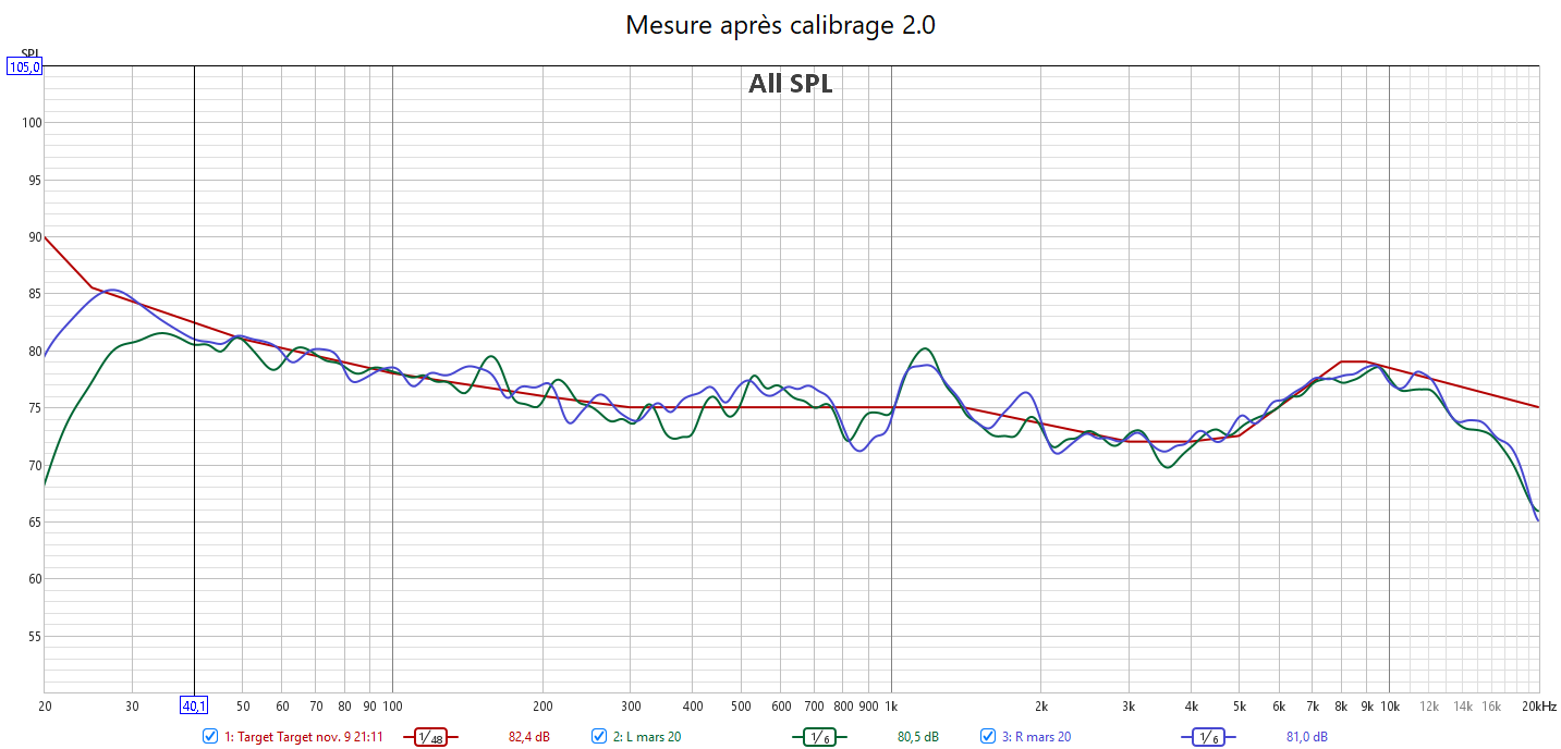 Après calibrage : la courbe cible diffère du HC dans le grave. En HiFi, du gain dans le grave est nécessaire. C’est en parti pour cela qu’écouter de la HiFi en 2.0 avec un calibrage cinéma ne fonctionne pas. Les réponses sont bonnes avec une montée presque linéaire et progressive dans le grave jusque 30 Hz. Il n’y a plus de pics liés aux ondes stationnaires. La réponse dans l’aigu et l’extrême aigu est bonne.