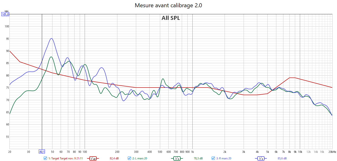 Avant calibrage : les colonnes SVS ont ce qu’il faut dans le grave, mais la réponse manque de linéarité à cause des ondes stationnaires. Tout comme la réponse d’un caisson est impactée par la pièce, la réponse d’une colonne dans le grave l’est également, et cela, quelque soit la marque ou le tarif de l’enceinte. La colonne droite descend plus bas dans le grave car elle est proche d’un coin, pas la colonne gauche. On constate une chute dans l’aigu au-dessus de 8kHz (comme énormément d’enceintes de toutes marques et gammes). Cela provoque une perte de clarté et de musicalité.