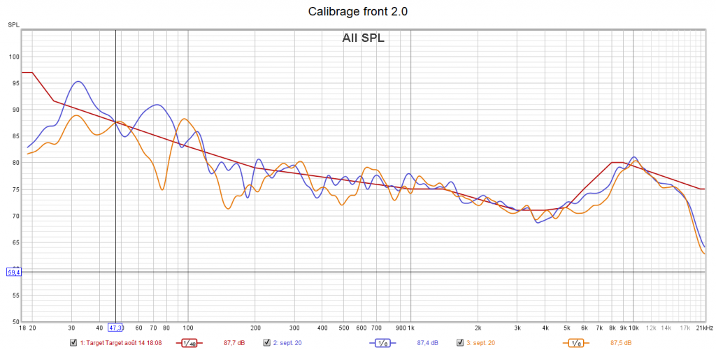 Un calibrage HiFi est effectué avec un gain dans le grave à +18 dB. Ici en 2.0, la réponse dans le grave des Wharfedale dans cette pièce est surprenante. Le rendu est équilibré dans le grave (pas de palier) et le gain dans l’extrême aigu apporte beaucoup de musicalité, les instruments sont mieux détaillés, plus naturels. Le tout sans agressivité.