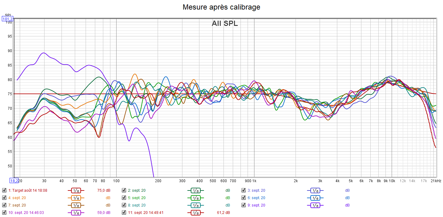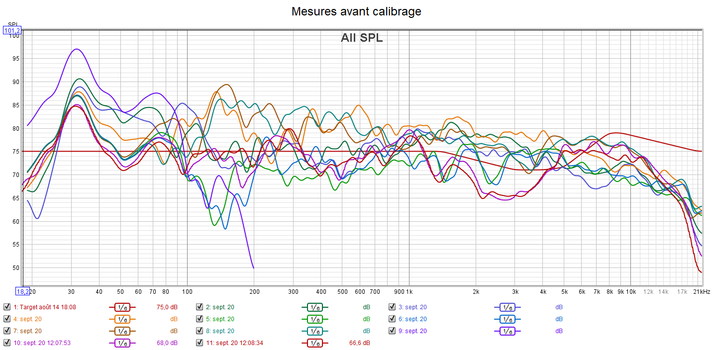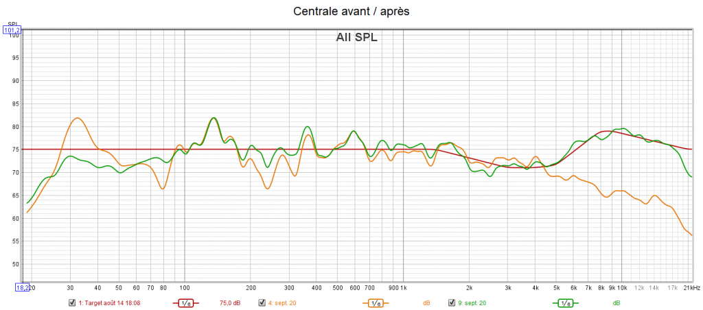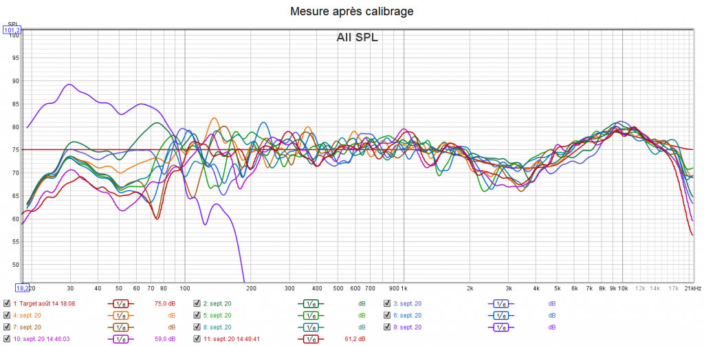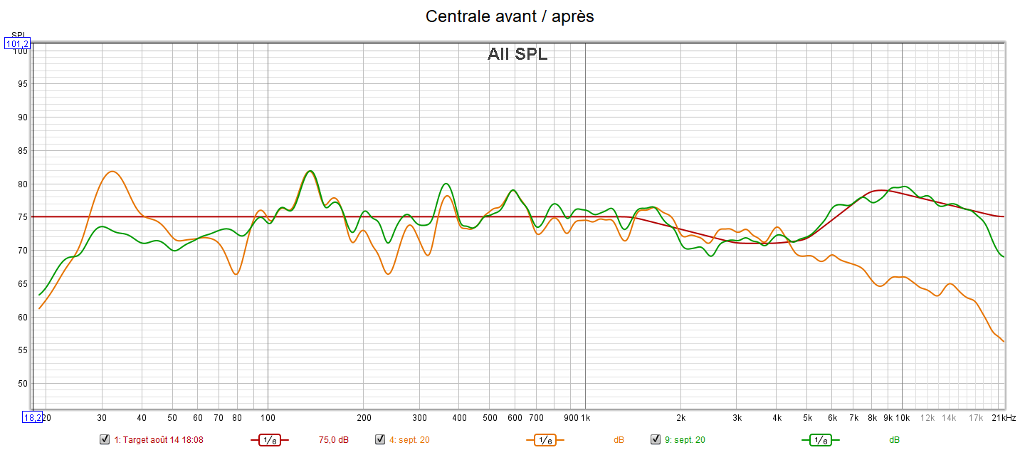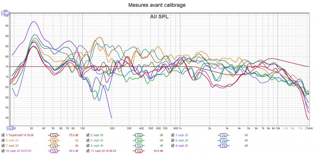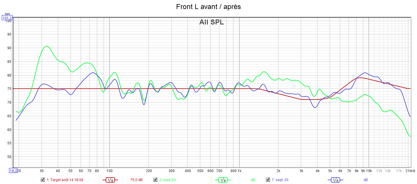Avant la première écoute, le client a une première critique concernant l’agressivité du rendu dans l’aigu et effectivement, à l’écoute, on constate rapidement cette agressivité à l’oreille. Cela est confirmé par les mesures avec des niveaux sonores importants sur la plage de sensibilité de l’oreille : 2-5 kHz. On constate également une disparité des niveaux sonores entre les différents canaux. La réponse des enceintes chute toutes dans l’extrême aigu créant un manque de clarté, de finition, de détails dans le rendu sonore. Cette chute est accentuée par la baisse des fréquences 8 et 16 kHz dans les égaliseurs de l’ampli. Le client a essayé de résoudre sont problème d’agressivité. Ce ne sont pas les bonnes fréquences à corriger. Le grave présente un pic gênant vers les 31 Hz. On observe également des problèmes de phase aux crossover.