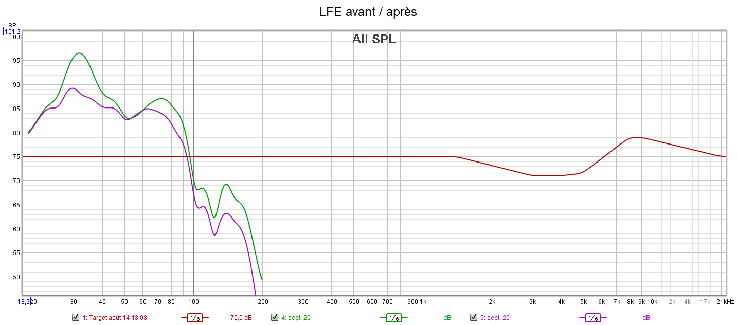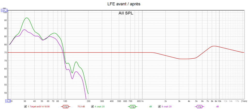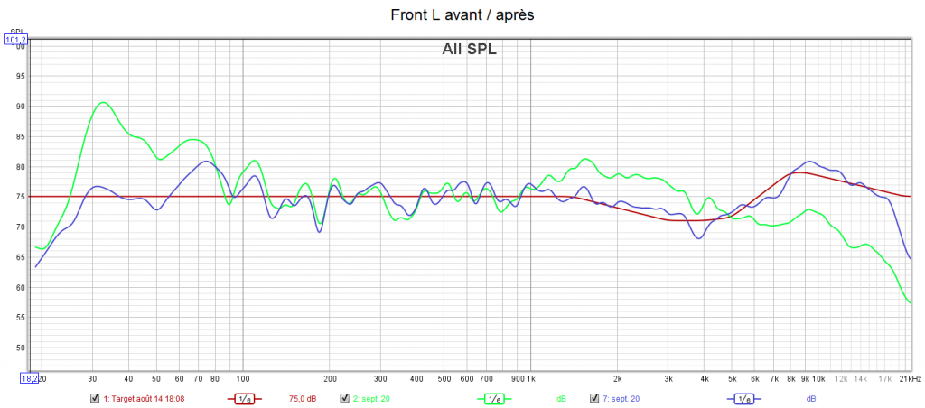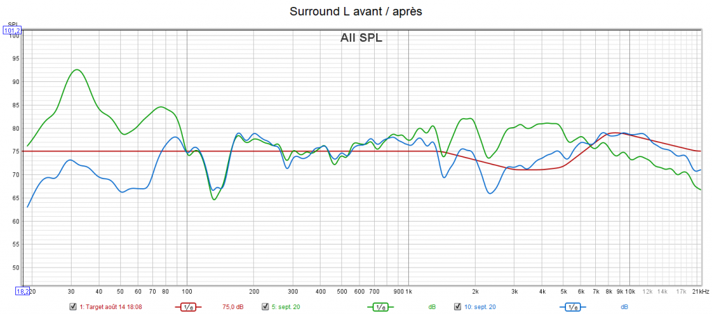 Ci-dessous la correction de la frontale gauche, la centrale, la surround gauche et le LFE. La réponse du LFE tient compte de la correction avec l’antimode Dspeaker. Je m’attendais à une meilleure correction, mais c’est quand même nettement mieux qu’avant.