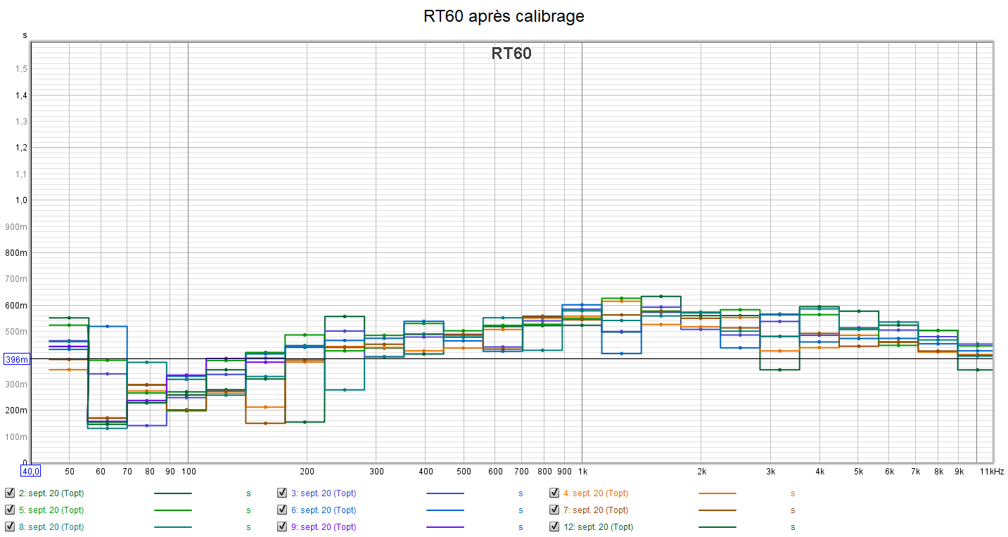 Concernant l’acoustique, le RT60 de la pièce se situe majoritairement entre 500 et 600 ms. On est un peu en dessous de ces valeurs pour le grave, ce qui est bien. Descendre vers les 400 ms serait un vrai plus pour l’amélioration et la précision des médiums / aigus. Également pour l’écoute Hi-Fi ce qui mettrait davantage en valeur les colonnes Wharfedale.