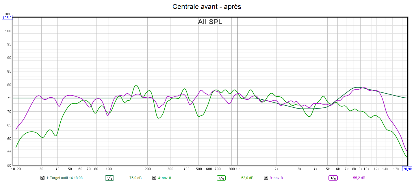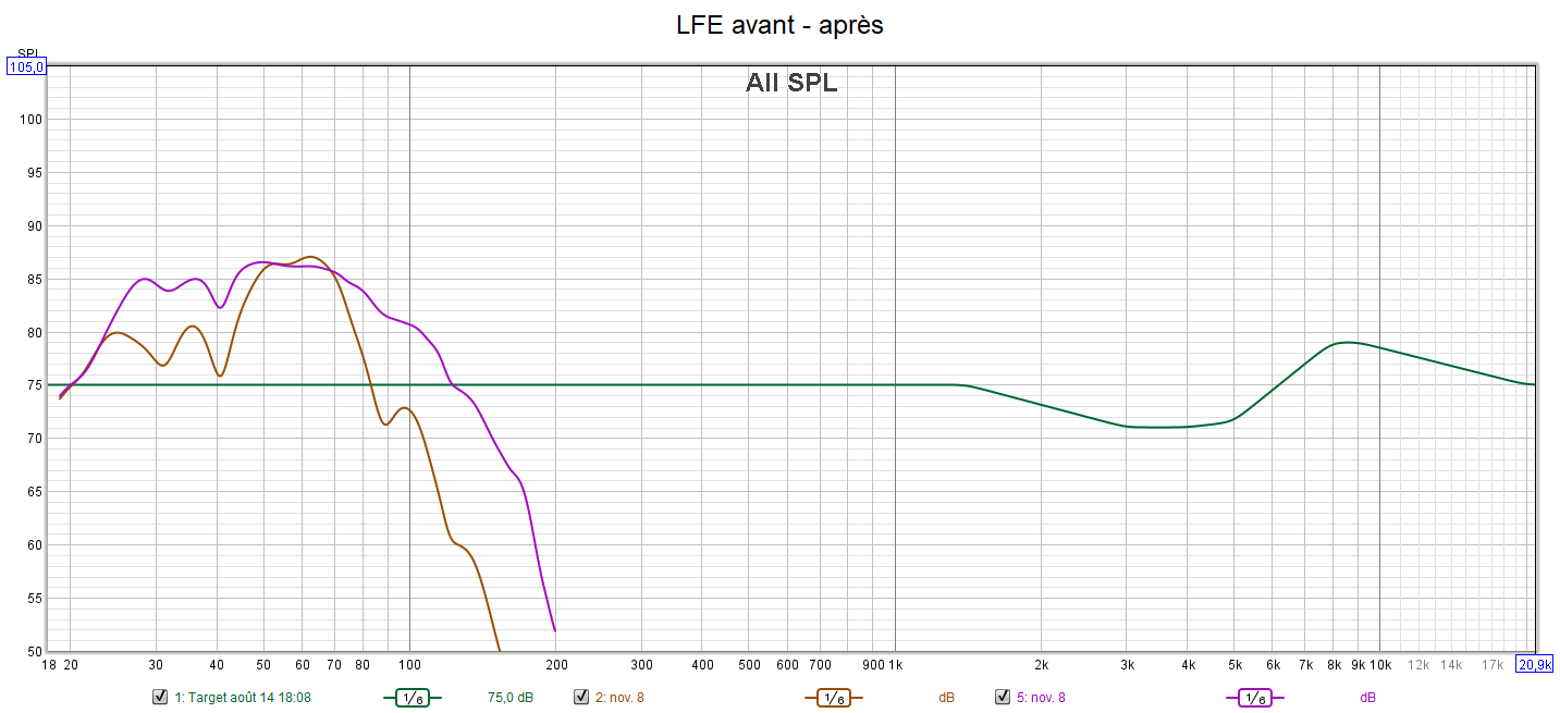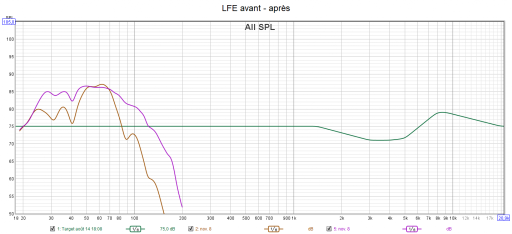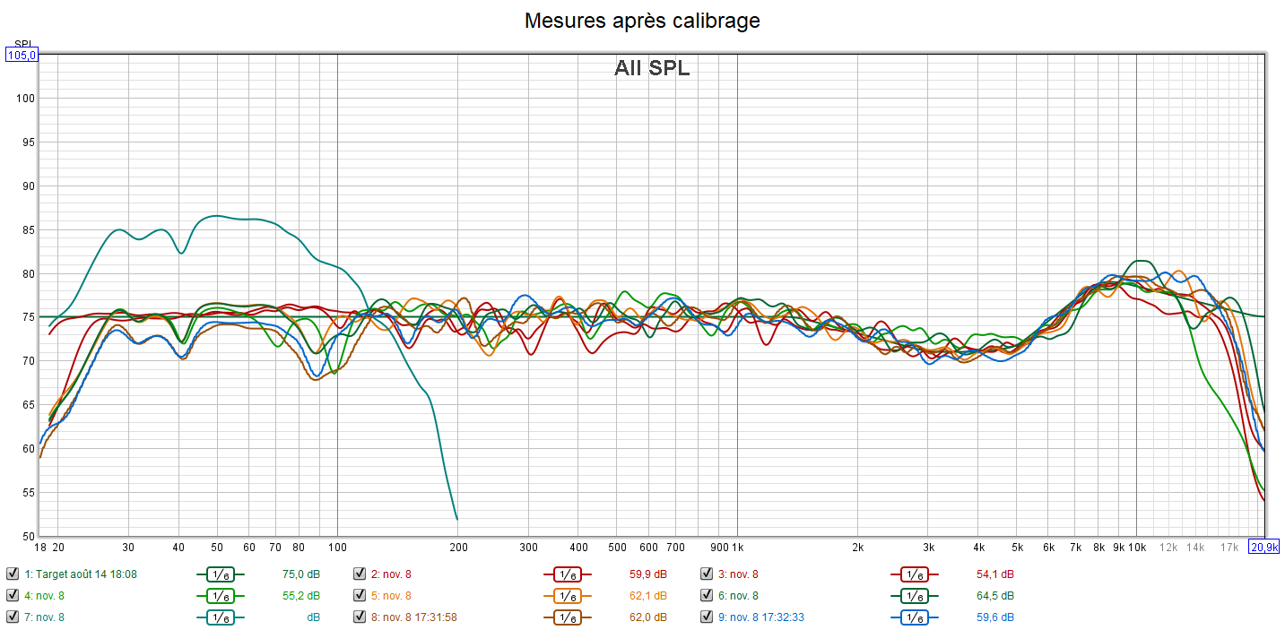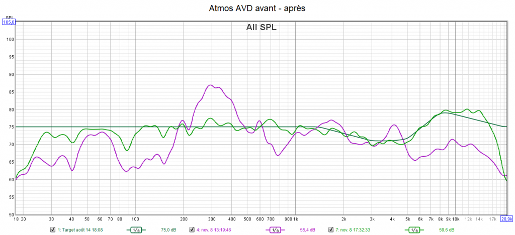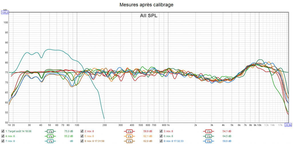 Après calibrage : la réponse des enceintes est incomparable et suit la courbe cible qui prend en compte la sensibilité de l’oreille suivant une extrapolation des courbes isosoniques de Flutcher et Munson. Le gain est important dans l’extrême aigu qui n’est pas du tout agressif. Tous les niveaux sont parfaitement ajustés. La réponse dans le grave est bien meilleure, mais le caisson ayant des capacités limités, les colonnes ont été mises en « grande » pour ne pas trop le charger. Cela est possible dans ce cas de figure car les colonnes descendent aussi bas en fréquence que le caisson. L’écoute est désormais optimisée, détaillée, bien spatialisée et la bulle sonore est homogène grâce à l’alignement précis des niveaux.