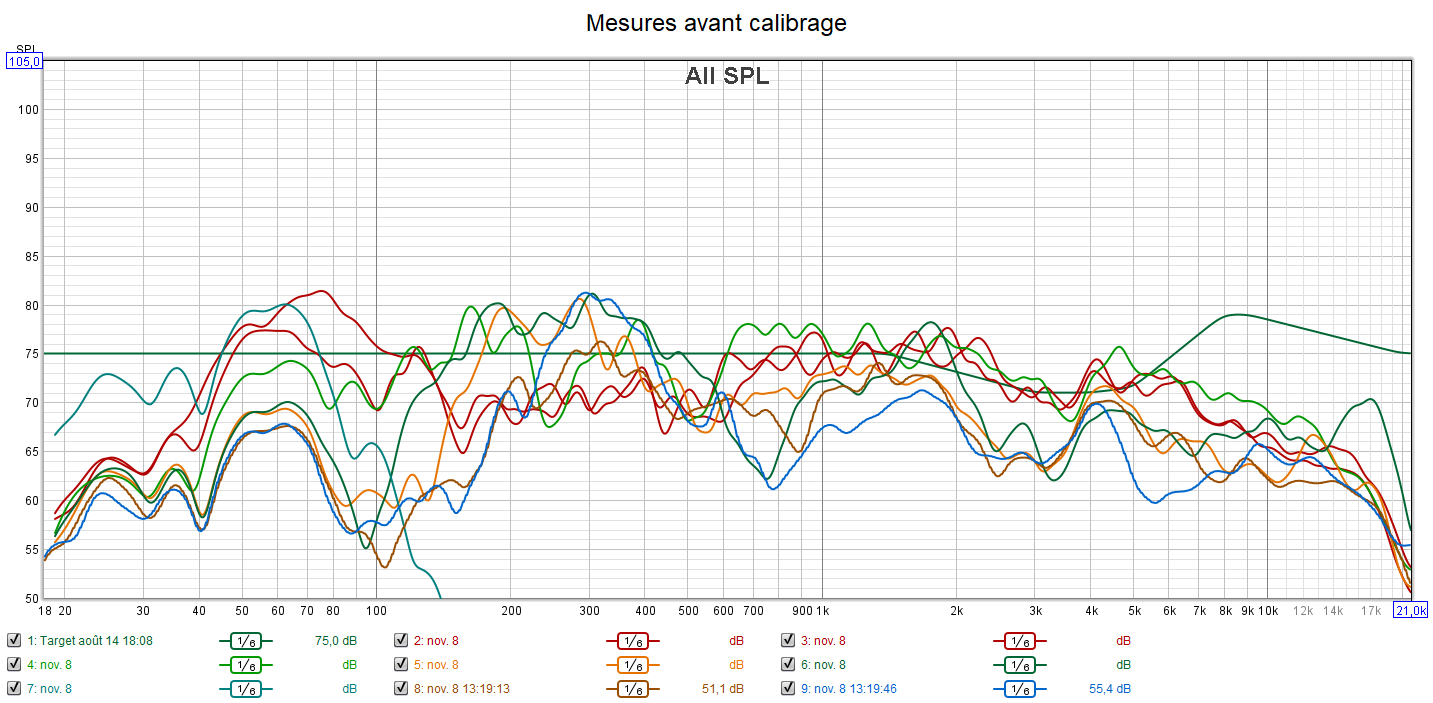 Avant calibrage : on peut constater sur les relevés le désordre d’une installation sans aucun calibrage. Les niveaux ne sont pas alignés. Les réponses n’ont pas du tout de linéarité et on constate une chute des réponses passé les 6 kHz. On perd carrément une partie de la plage audible. Le caisson est en retrait donc manque de grave dans le rendu sonore. Rien ne va.