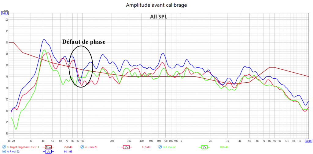 Ici les mesures avant / après des colonnes droite et gauche ensemble : la correction a modifié la phase et a permis de corriger le défaut entre 90 et 100 Hz (courbe rouge) lorsque les 2 enceintes fonctionnent ensembles. Il n’y a plus de pic dans le médium. La réponse est bien plus linéaire. J’ai corrigé la mise en retrait de l’aigu initialement excessive et le gain dans l’extrême aigu finit de rééquilibrer la tonalité pour un rendu bien plus musical.