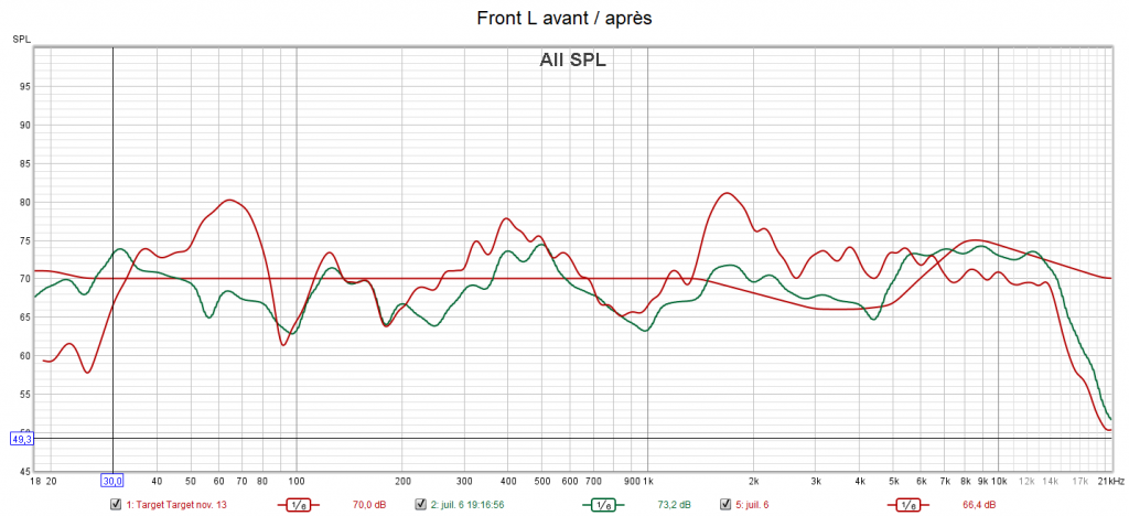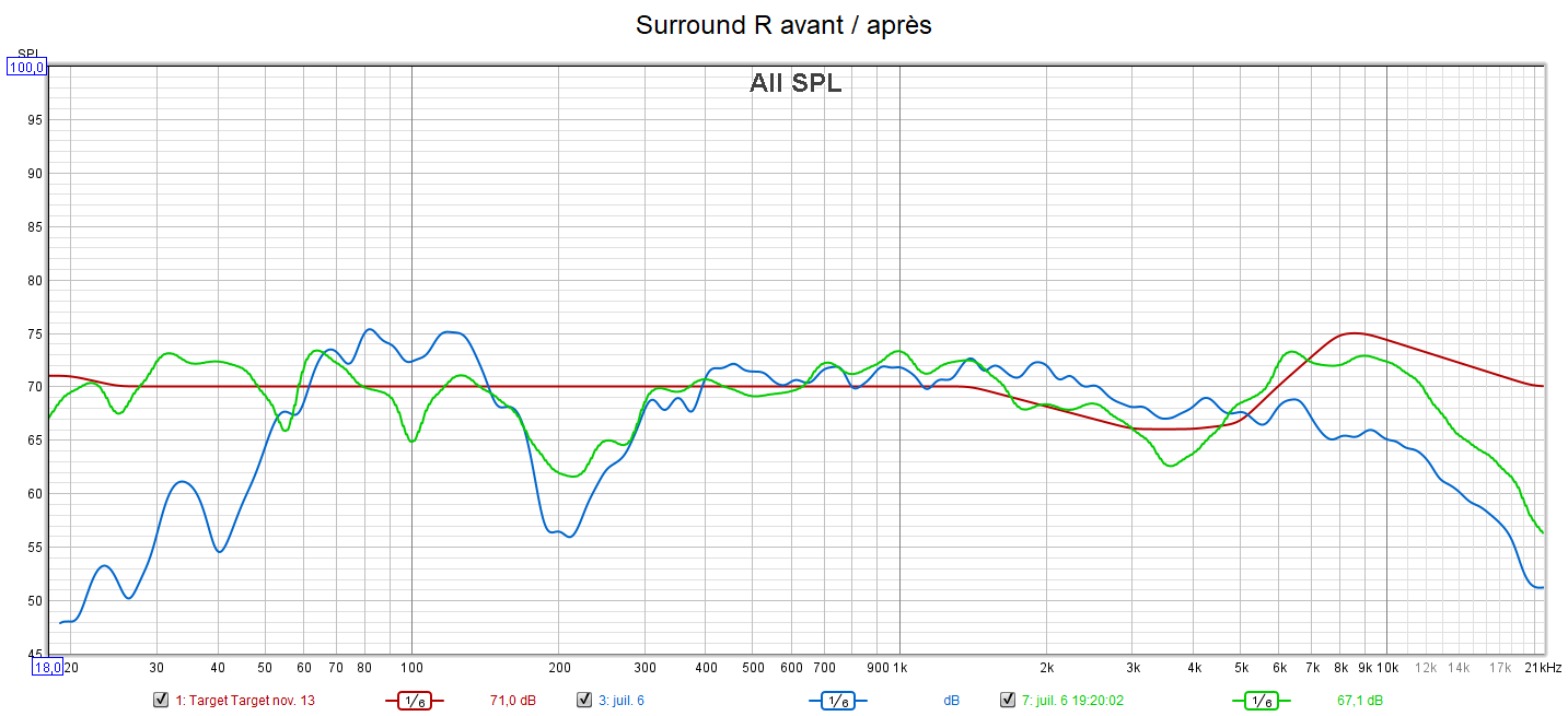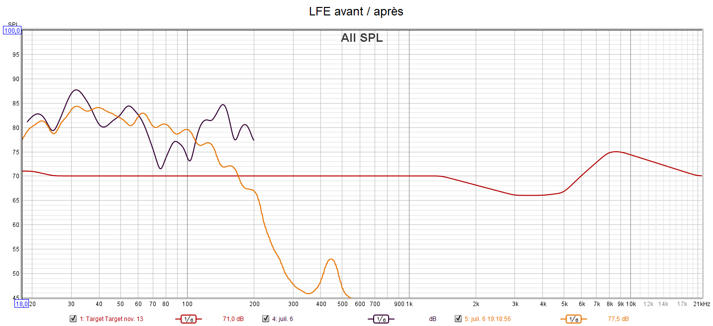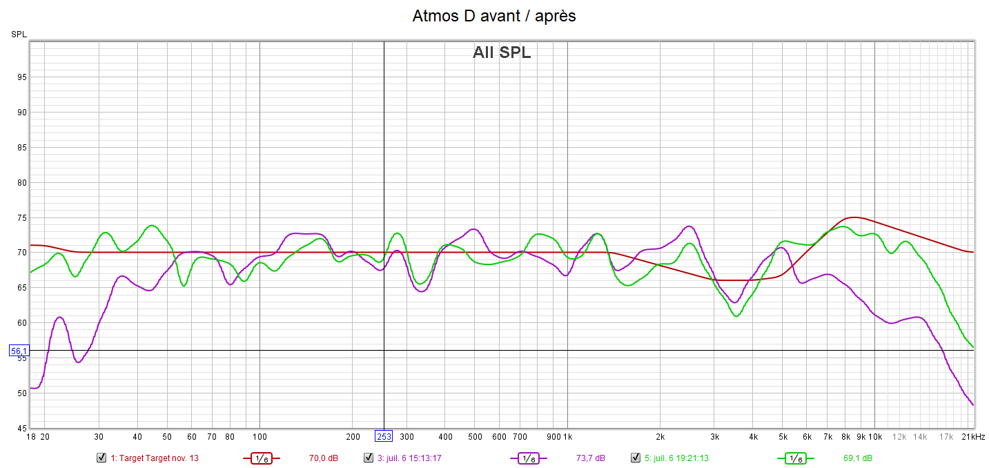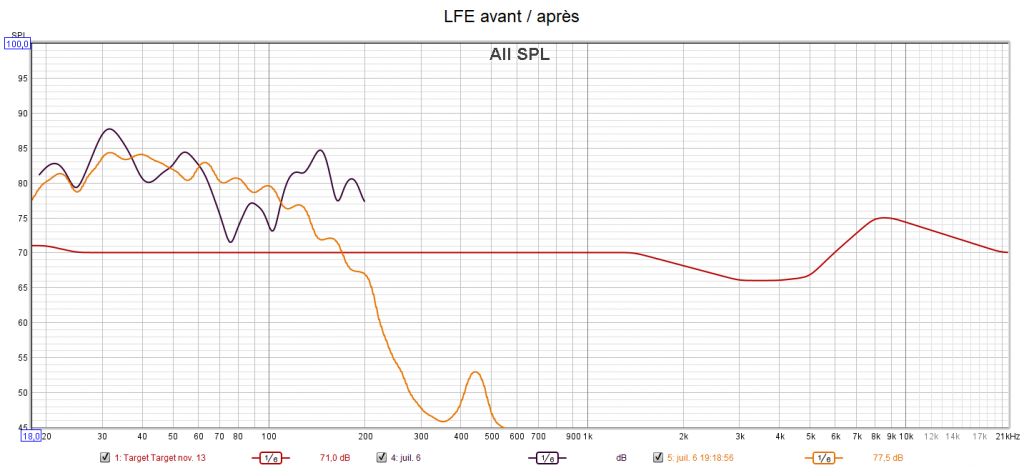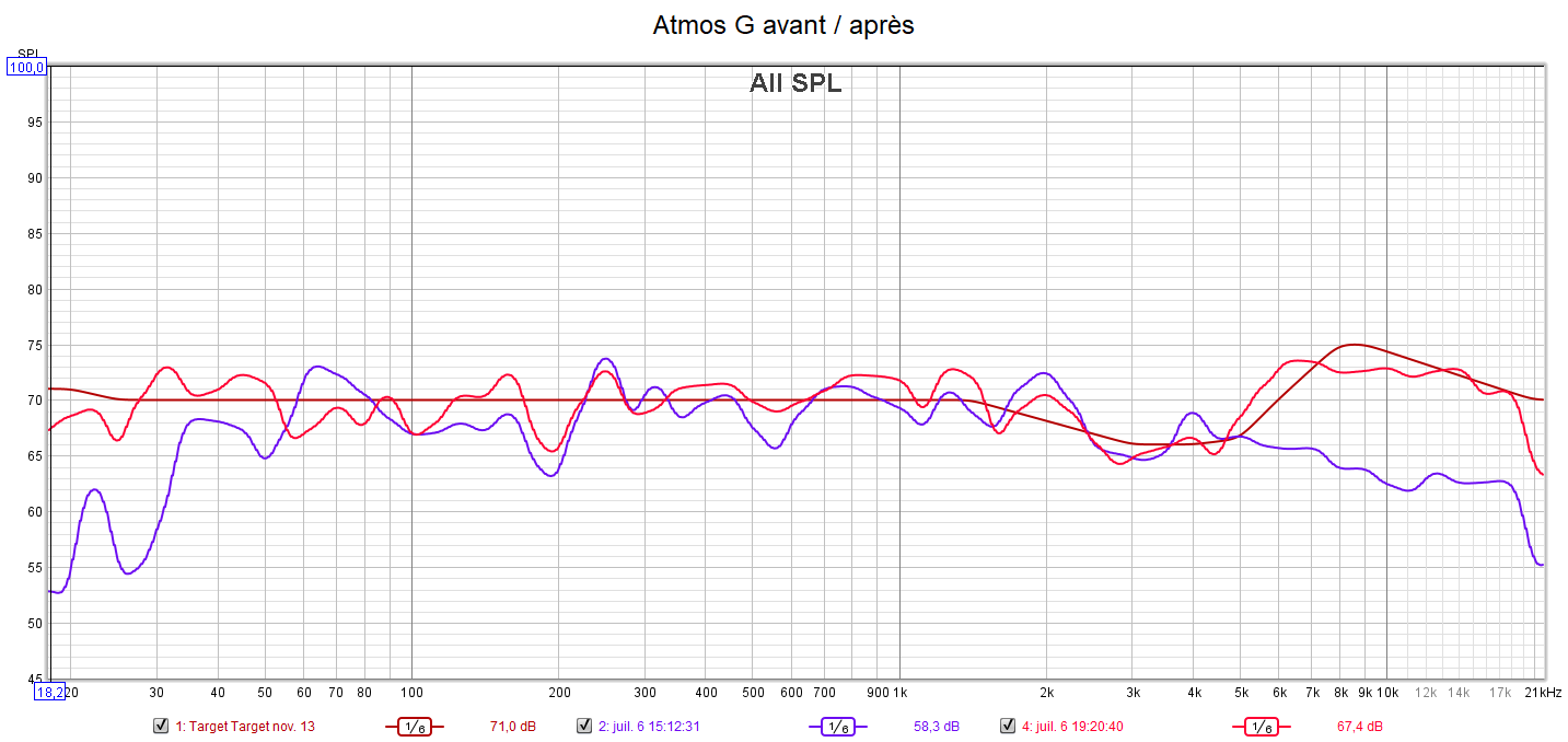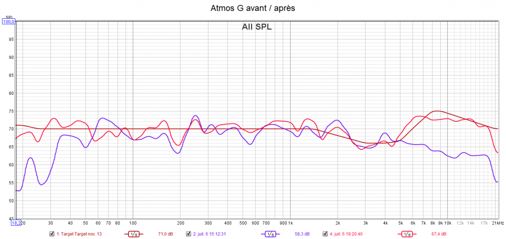 Ci-dessous la correction des frontales droite et gauche, la surround droite, les atmos et le LFE. On n’avait pas d’agressivité dans le son avant calibrage. Tout cela avec les égaliseurs paramétriques du Rotel RSP 1576. Après repositionnement des caisson, mis en phase et égalisage, la réponse du LFE est bien mieux.