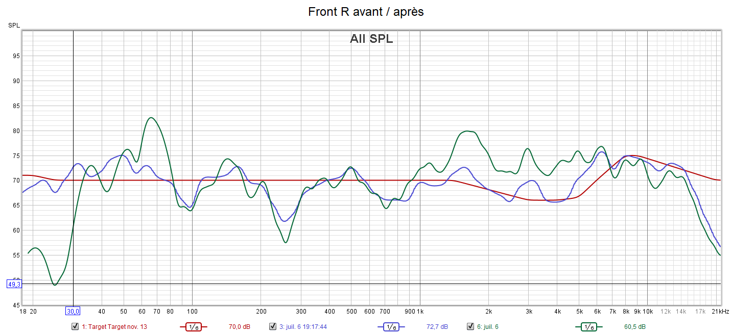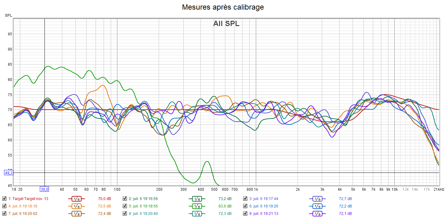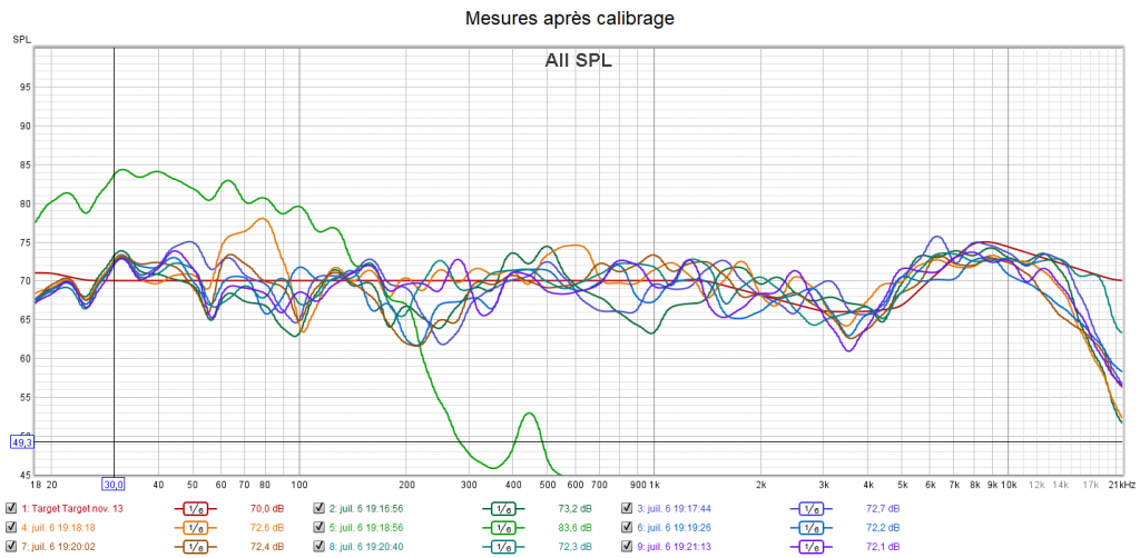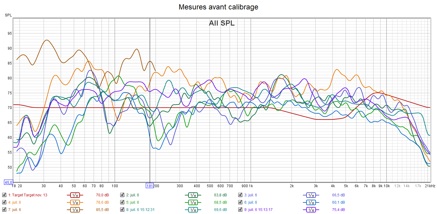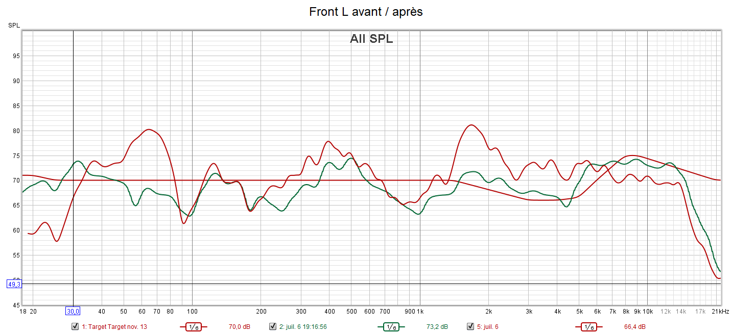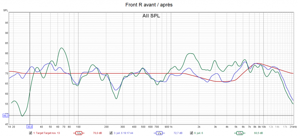 Ci-dessous la correction des frontales droite et gauche, la surround droite, les atmos et le LFE. On n’avait pas d’agressivité dans le son avant calibrage. Tout cela avec les égaliseurs paramétriques du Rotel RSP 1576. Après repositionnement des caisson, mis en phase et égalisage, la réponse du LFE est bien mieux.
