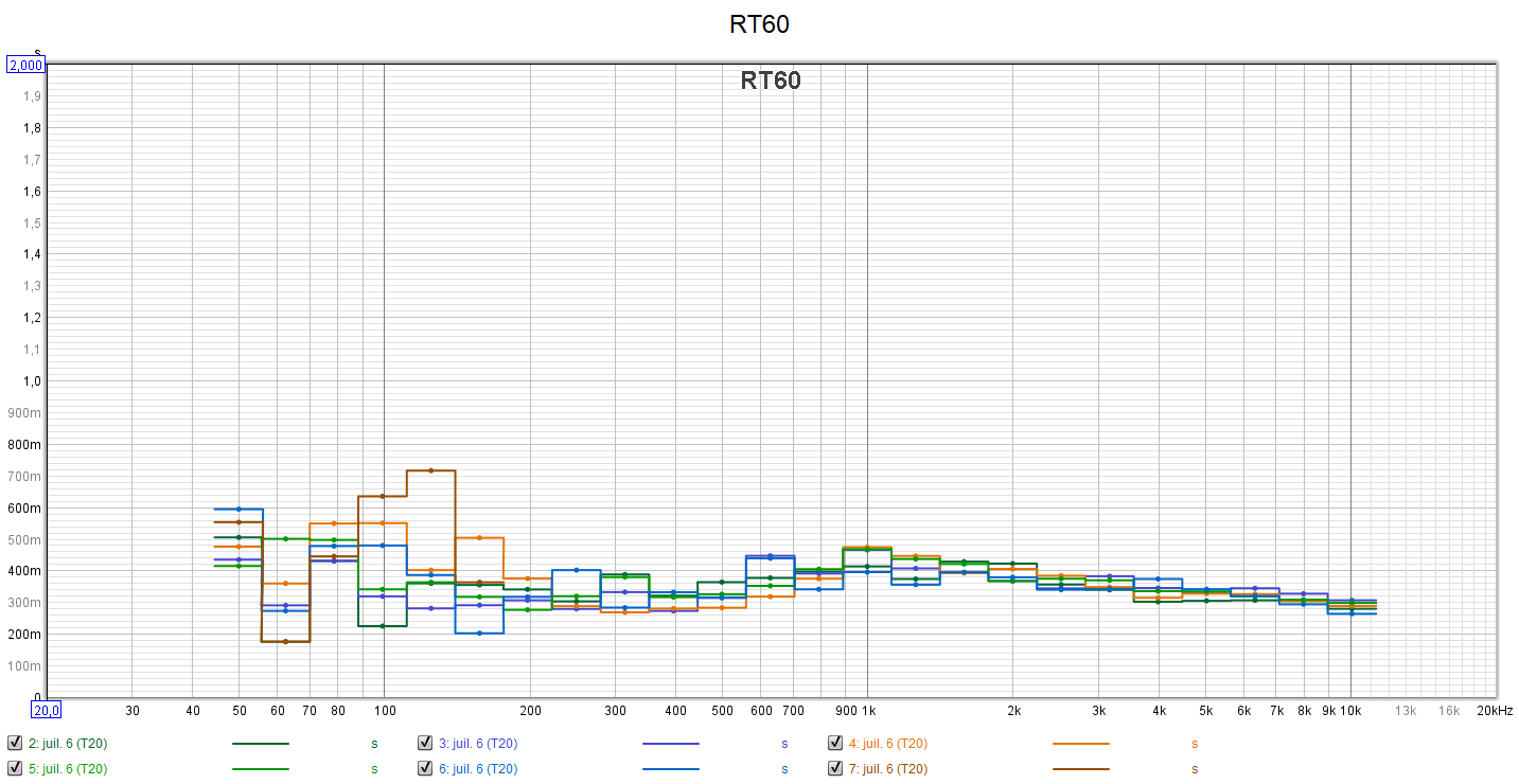 L’acoustique de la pièce est tout à fait correcte. Le RT60 (résonance de la pièce) est à 400 millisecondes. C’est la limite max, donc ça va. Idéalement il faut être entre 400 et 200 ms. La distorsion du son dans sa globalité est également correcte. On est dans les valeurs que je mesure habituellement.