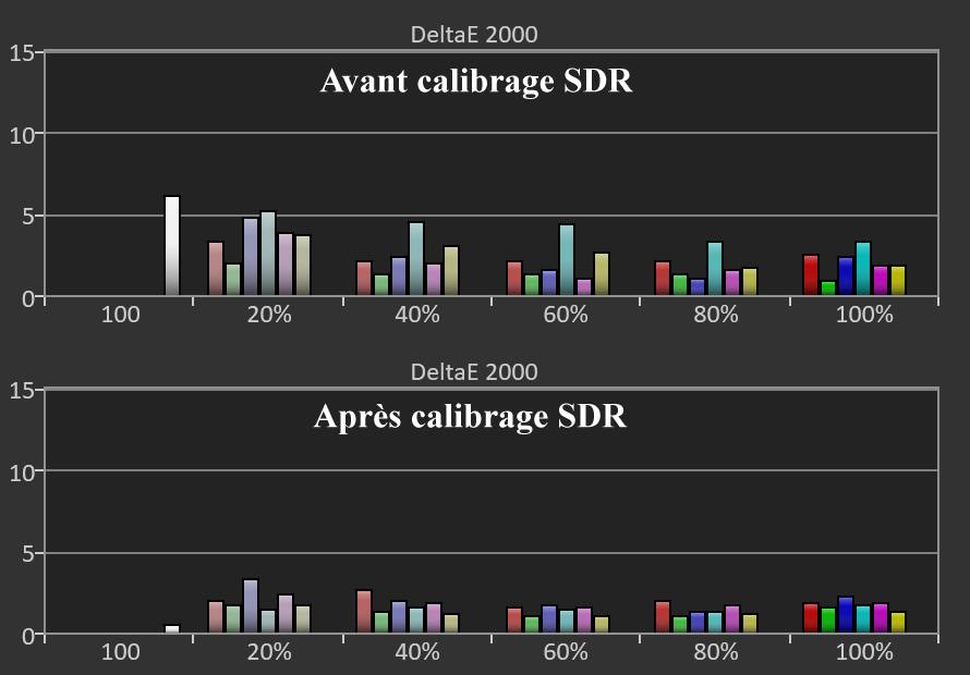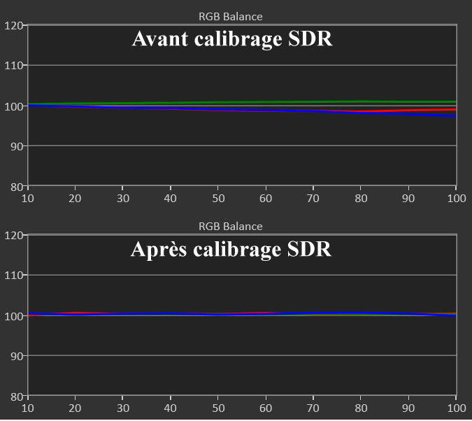 Après calibrage SDR, la balance des blancs se corrige très bien pour obtenir un delta E moy de 0,6 avec un max à 1,4. Je place le pic de luminance à environ 114 nits. On reste supérieur à la recommandation pour ne pas trop perdre en luminosité.