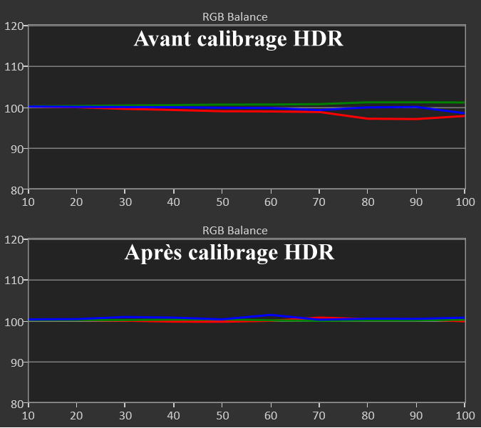 Après calibrage HDR, le delta E moy de la balance des blancs descend à 1,2 et un max à 2,4. Le pic de luminance baisse légèrement à 1100 nits à cause de la suppression de l’excès de vert.