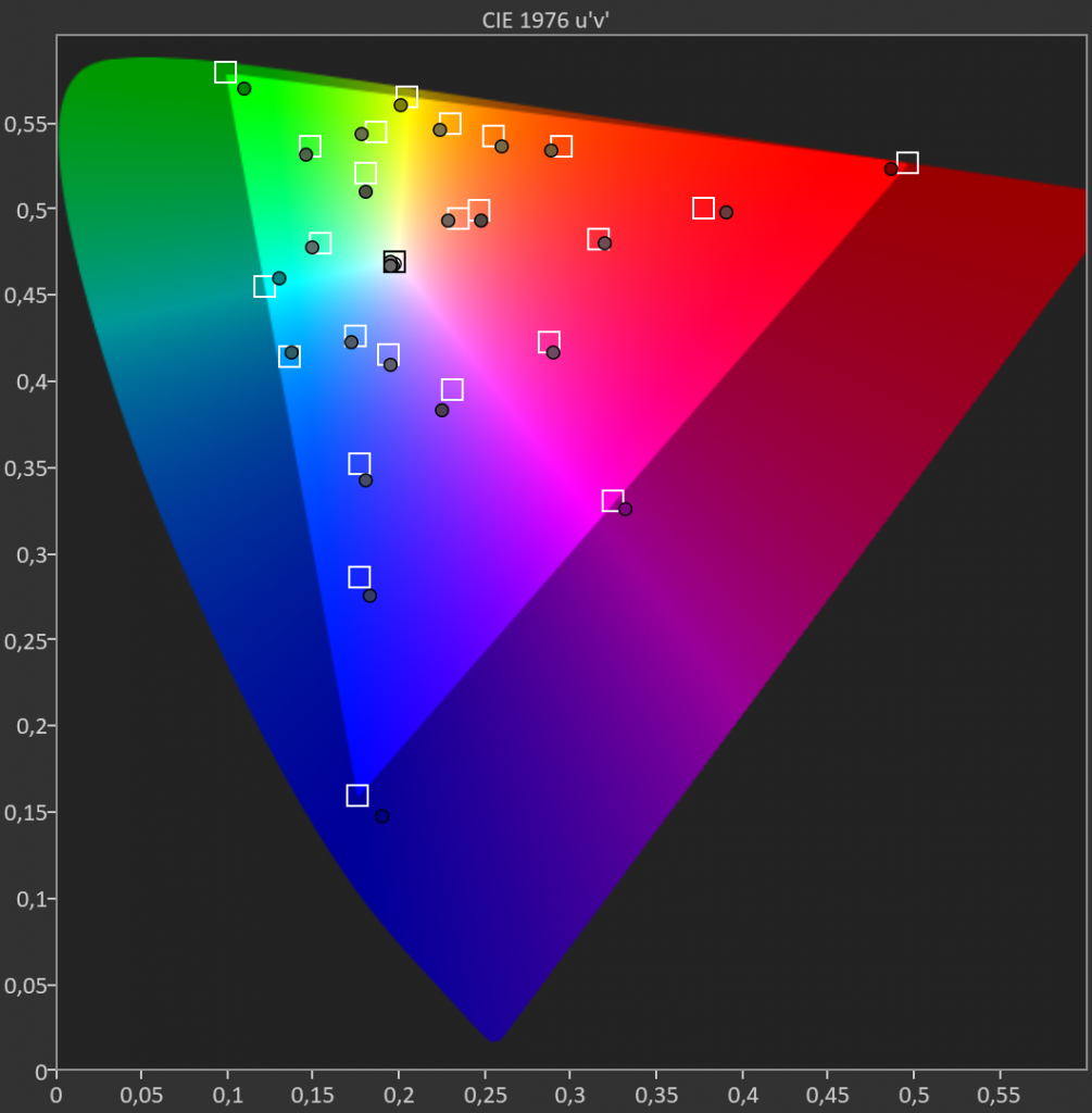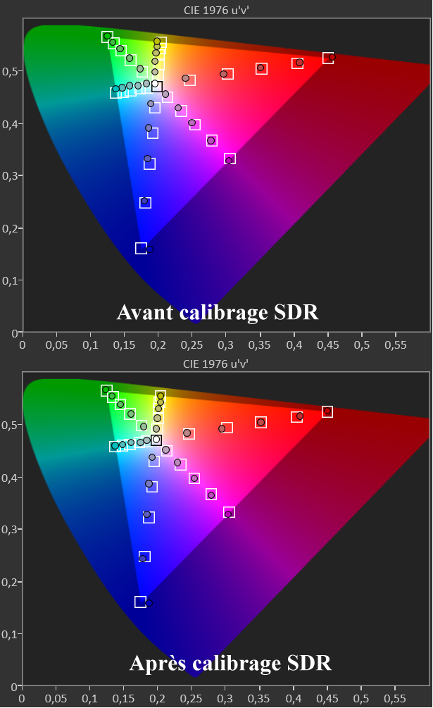 Avant calibrage SDR, les couleurs ont un delta E moy de 2,7 avec un max à 5,2 dans le cyan (6,2, c’est le blanc). Le gamut (espace colorimétrique) REC709 de la norme SDR est parfaitement couvert.