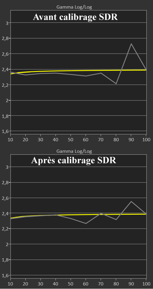 Avant calibrage SDR, le gamma est déjà pas mal du tout. Il se rapproche beaucoup de la norme BT1886 avec un gamma de référence à 2,4. On est légèrement en-dessous.