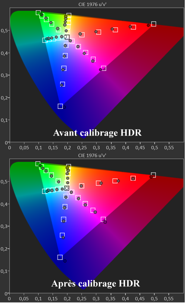 Aprtès calibrage HDR, le delta E moy des couleurs baisse à 1,1 avec un max à 3 et toujours quasiment 100% du DCI-P3 pour la couverture colorimétrique. Toujours de bonnes valeurs pour les couleurs avec un delta E moy à 1,3 pour le test du ColorChecker, ce qui est très bien pour du format HDR.