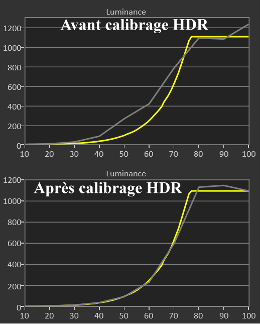 Avant calibrage HDR, la gestion de la lumière ne suit la courbe théorique. On a bien trop de luminance.