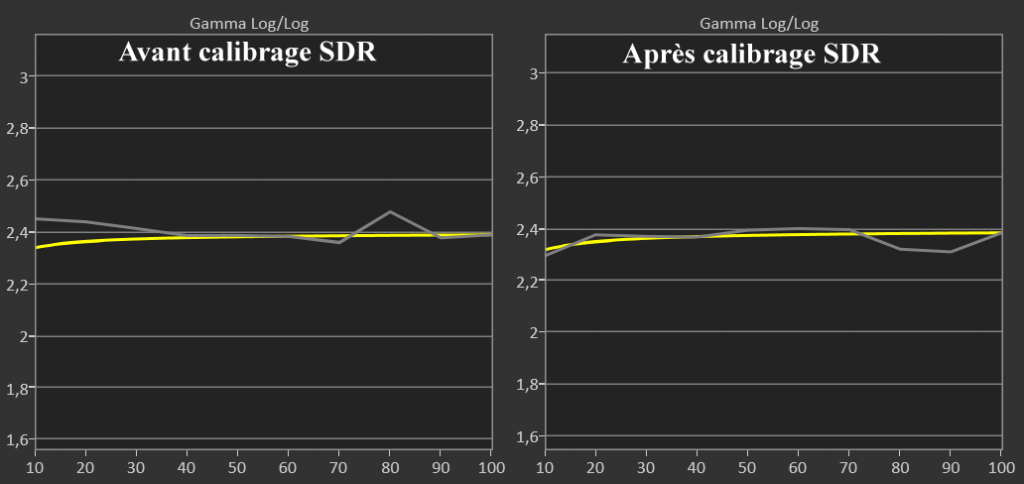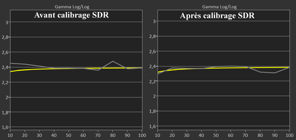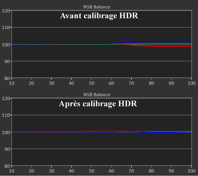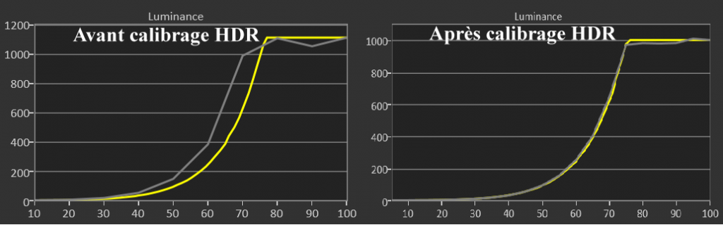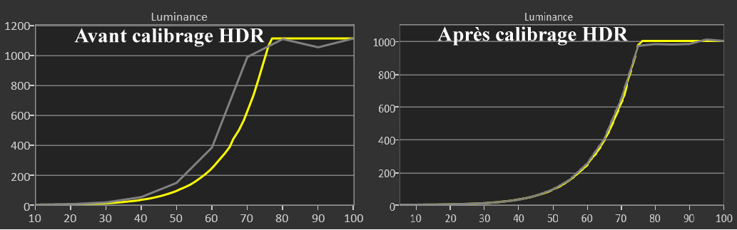 Avant calibrage HDR, on a un excès de luminosité par rapport à la courbe de luminance ST2084. Le 50% blanc est à 146 nits au lieu de 94 nits. Si l’excès de lumière est flatteur à l’œil, il réduit la plage dynamique, ce qui va à l’inverse du format HDR. De plus, cela surexpose certaines hautes lumières, voire, les brûle. Le pic atteint 1100 nits. La luminosité en HDR, voir ici.