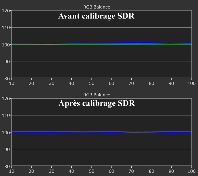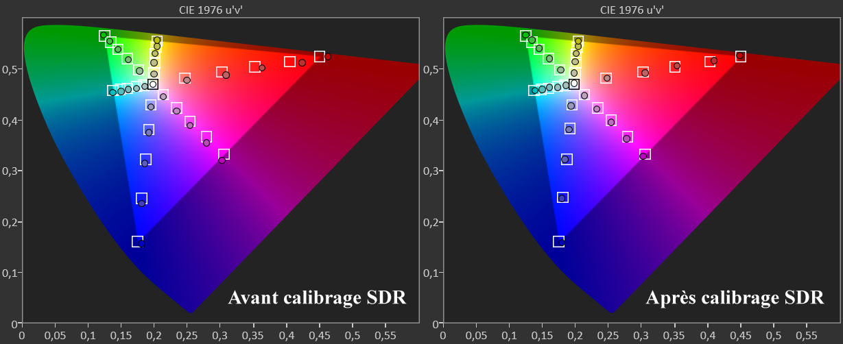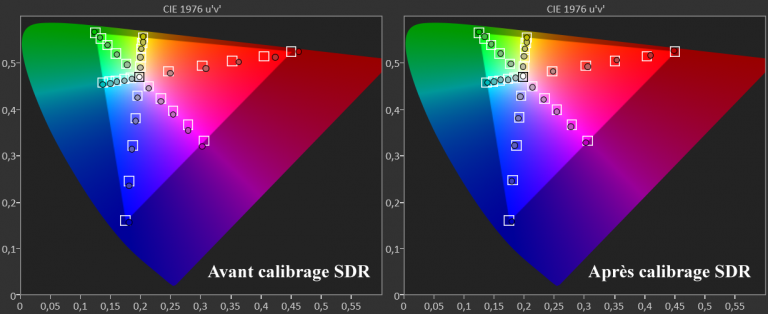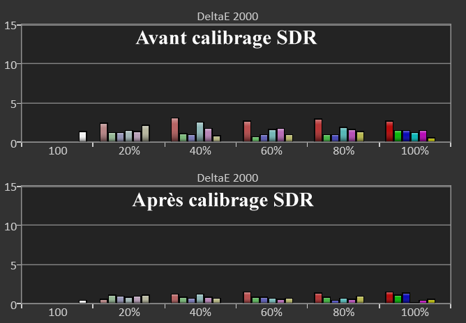 Après calibrage SDR, le pic de luminance descend à 134 nits (mode nuit). Le delta E moy du blanc baisse à 0,4.