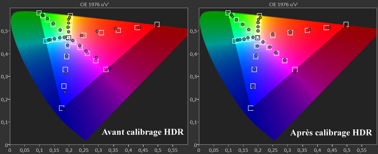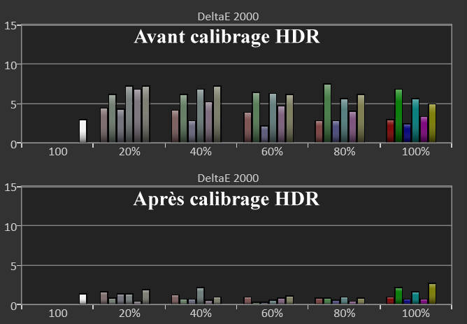 Avant calibrage HDR, pour les couleurs, on exploite toutes les capacités de l’écran avec le gamut DCI-P3. C’est donc plus compliqué qu’en SDR et on obtient un delta E moy à 5. Pas les bonnes luminances, pas les bonnes saturations…