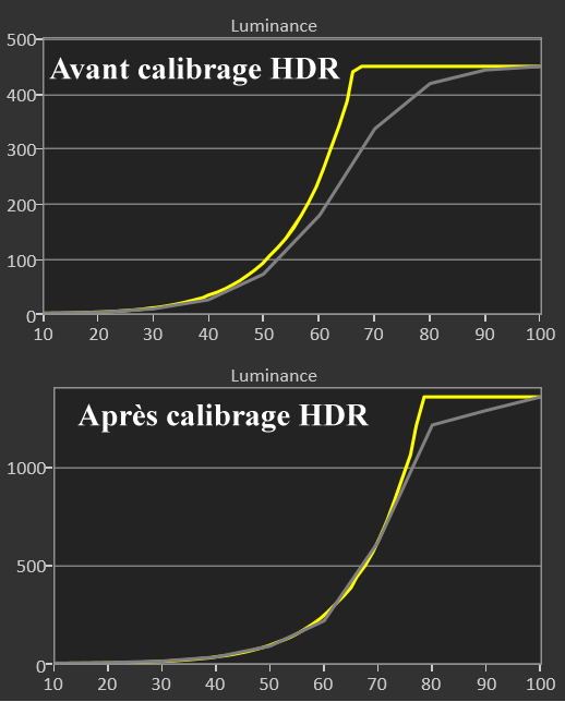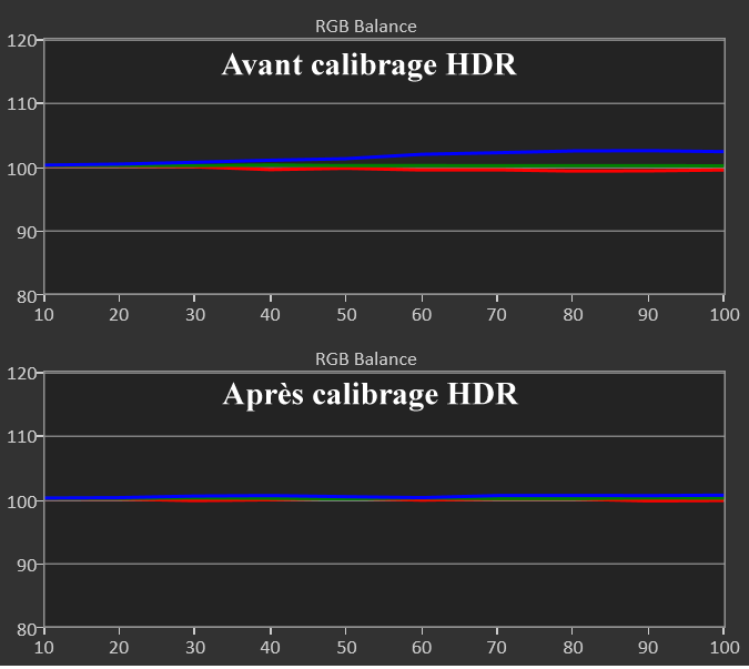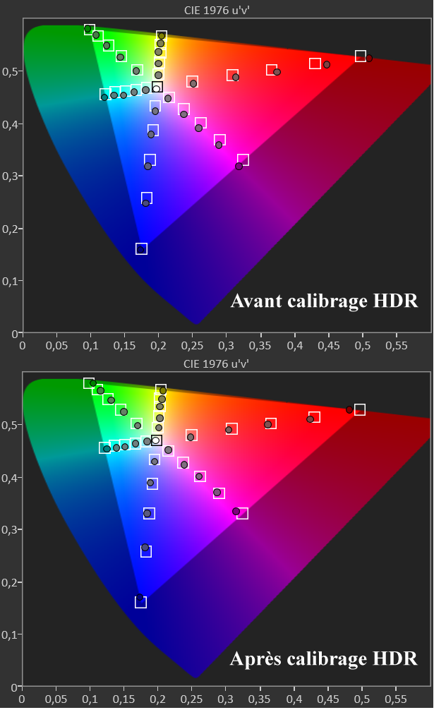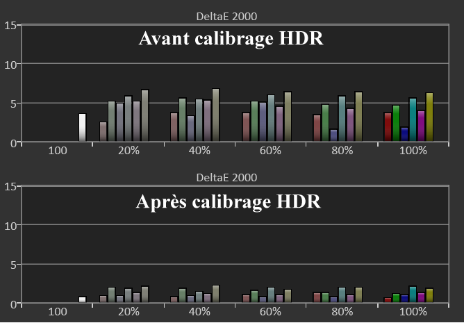 Avant calibrage HDR : tout comme en SDR, la balance des blancs est trop froide (excès de bleu) avec un léger manque de luminosité pour suivre la courbe normée ST2084. Cela se traduit par un delta E moy de 3,8 (max 7,2).
