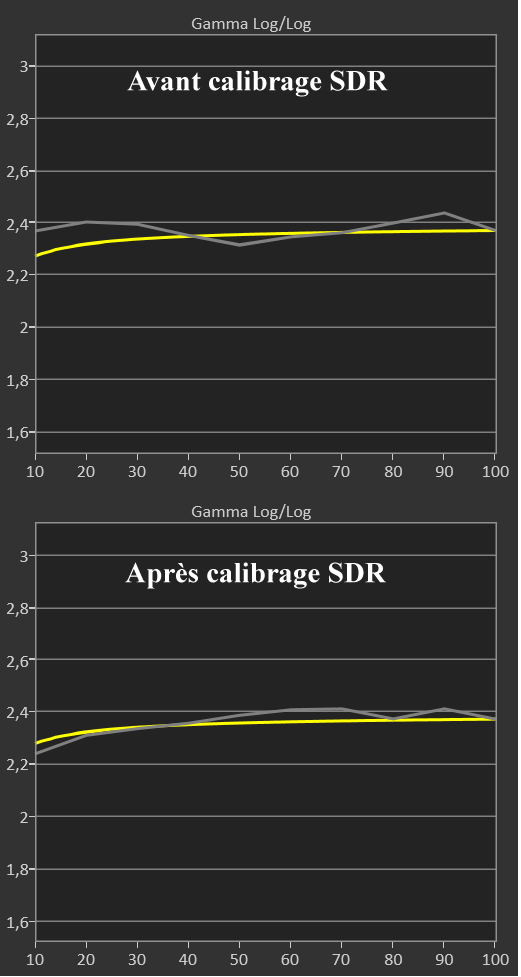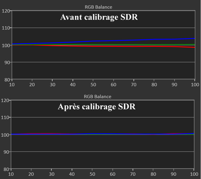 Avant calibrage SDR, la balance des blancs est trop froide (excès de bleu pour la norme D65). Le delta E moy est à 2,9 avec un max à 4,8. On souhaite rester sous 2. Le pic de luminance monte à 118 nits, ce qui, en pièce de vie est peu juste.
