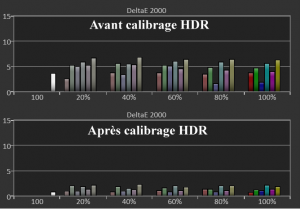Après calibrage HDR : je corrige la balance des blancs tout en exploitant totalement les capacités du Sony : on obtient un delta E moy de 1,4 (max 2,3). Les basses lumières sont légèrement relevées, ce qui est mieux en pièce de vie. Le rendu HDR n’a plus rien à voir avec avant, surtout en terme de pic de luminosité et donc du réalisme des images.