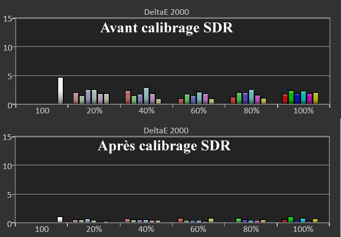 Après calibrage SDR, j’obtiens de très bonnes couleurs avec un delta E moy de 0,6 et un max à 1. Que de très bonnes valeurs.