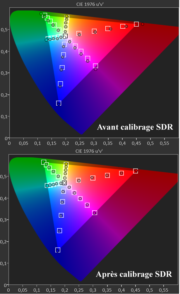 Avant calibrage SDR, la couverture colorimétrique dépasse légèrement la norme BT709 avec un excès global de saturation. Le delta E moy des couleurs est à 2 avec un max à 4,7.