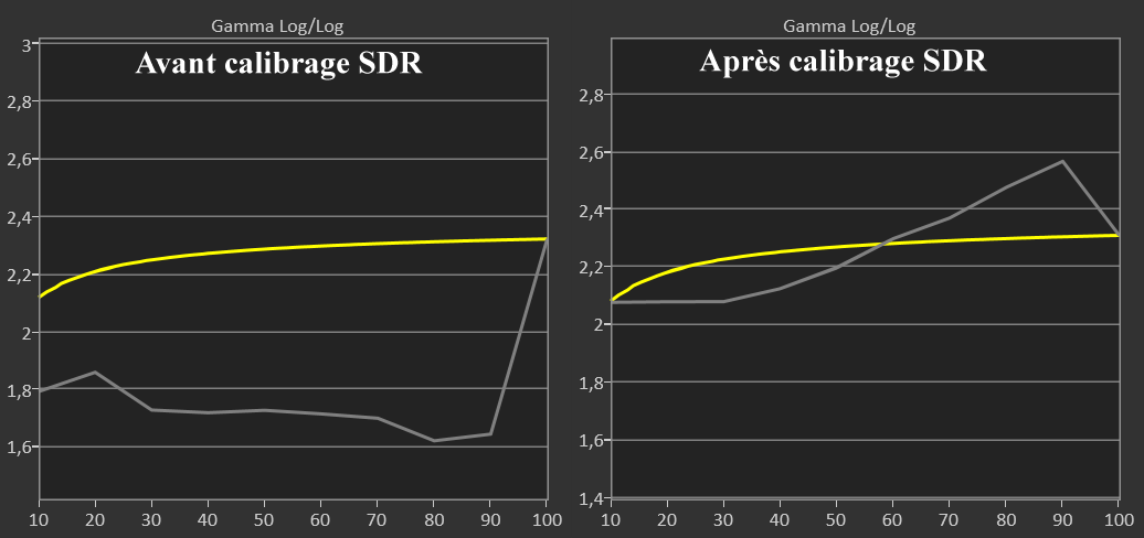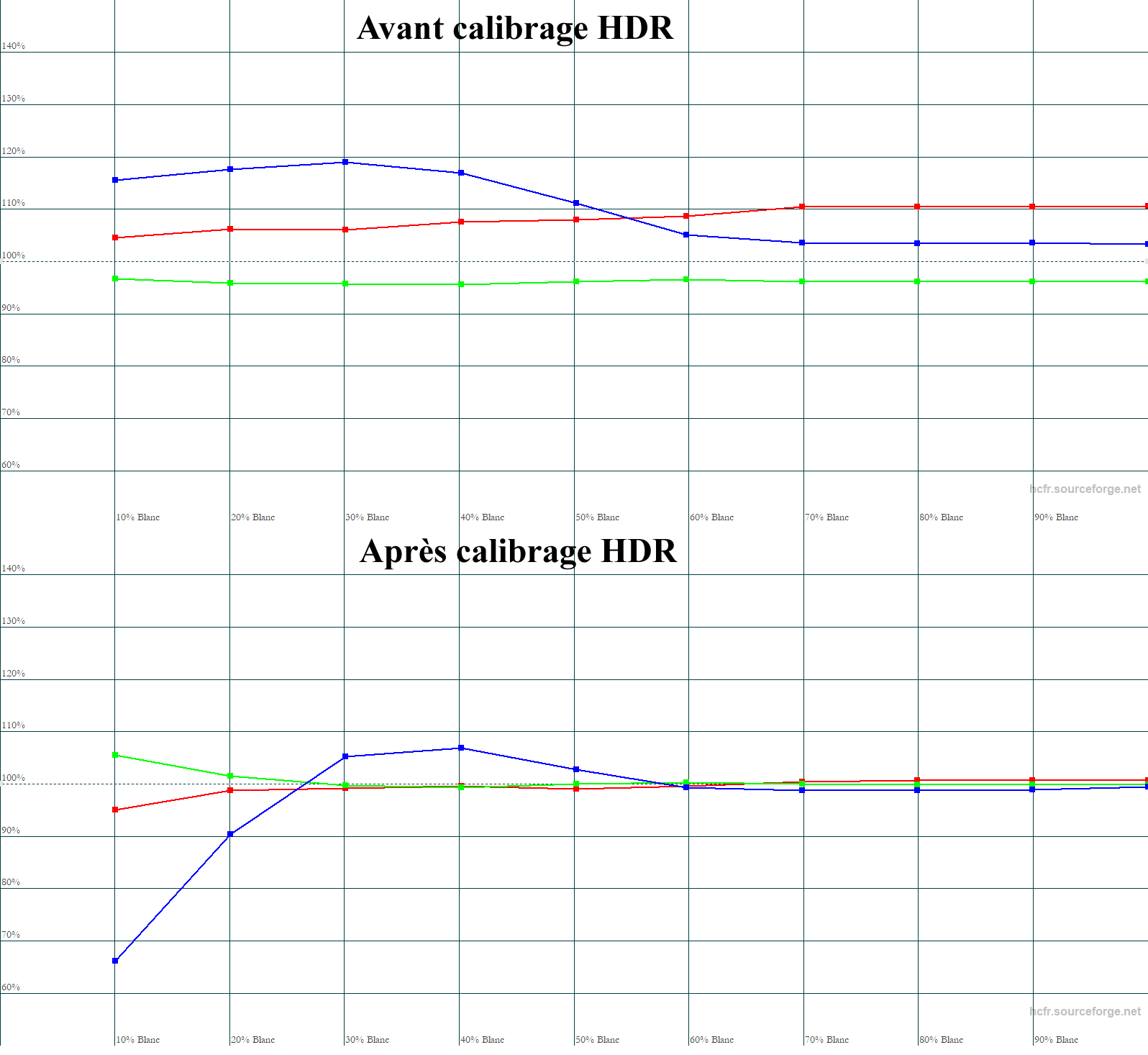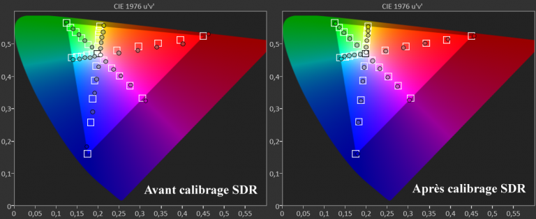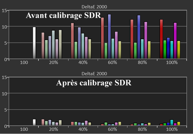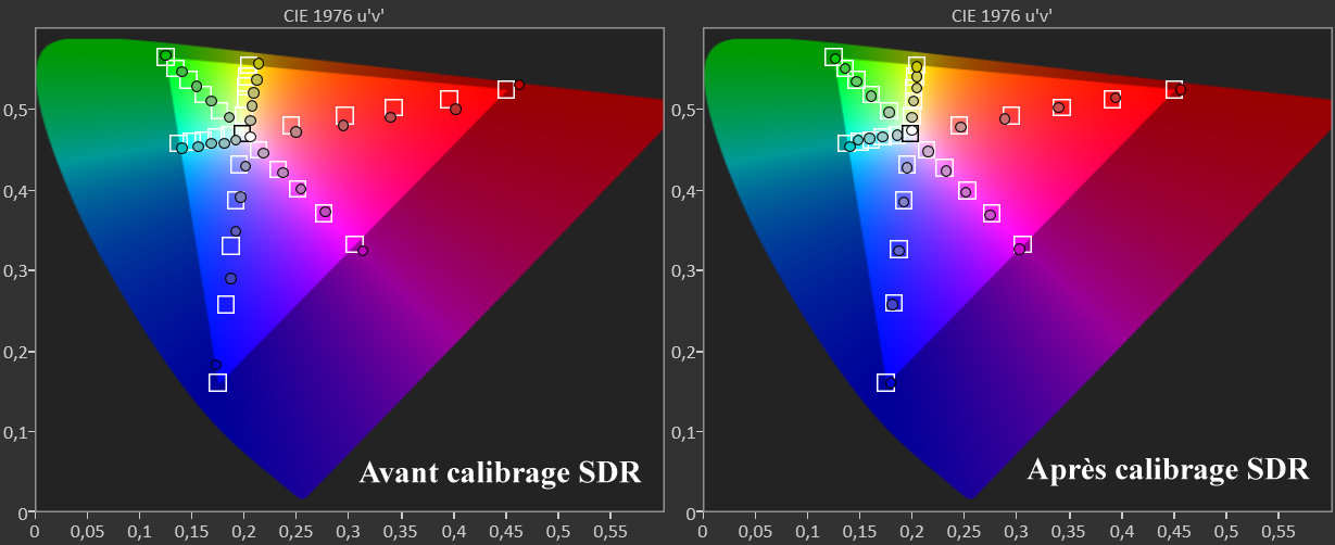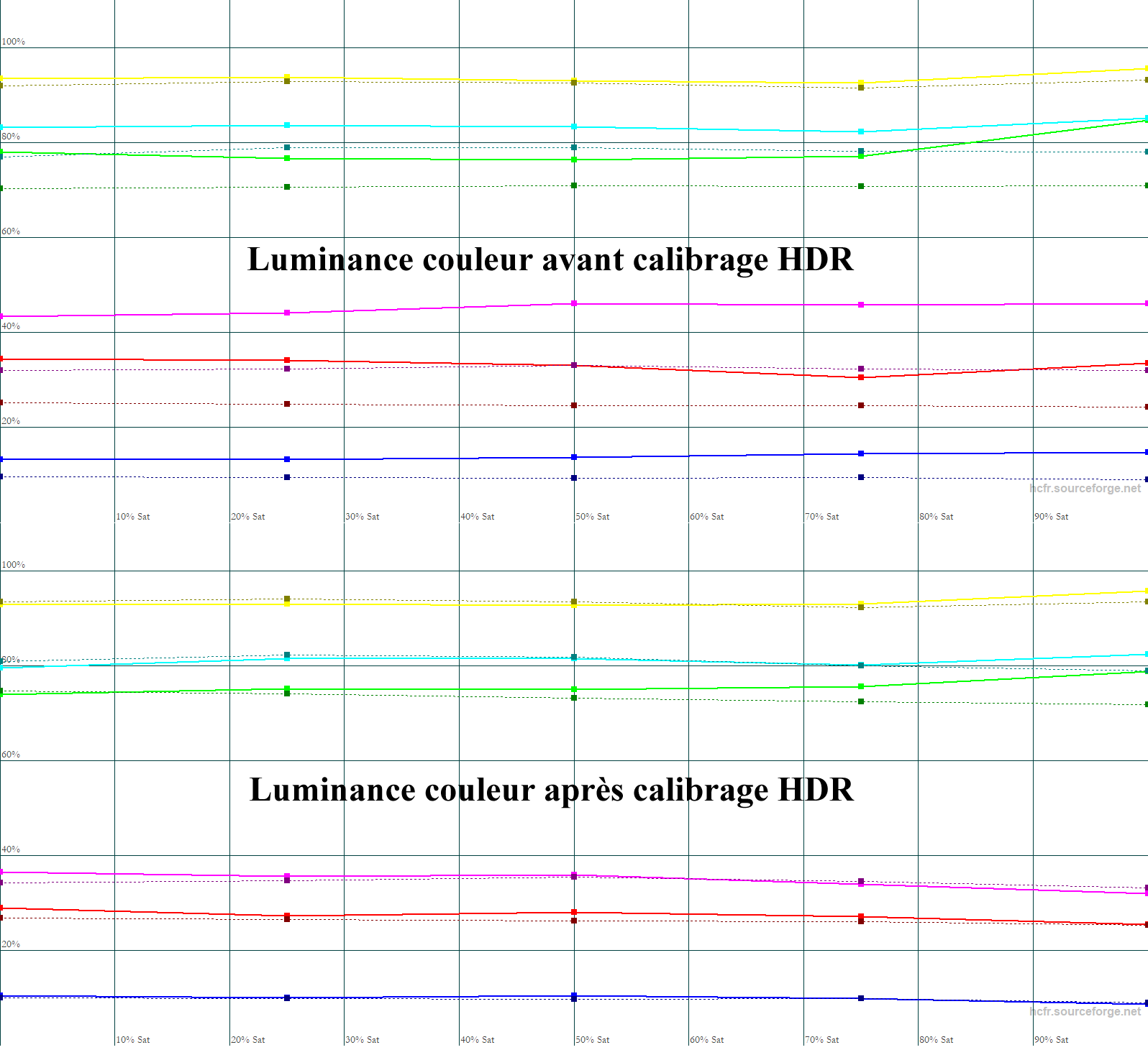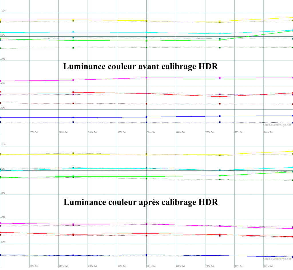Avant calibrage HDR, le delta E moy des couleurs dépasse 6 avec des défauts de teintes et de saturations. Le gamut n’est pas au max des capacités du VP. Le DCI-P3 peut être mieux couvert.