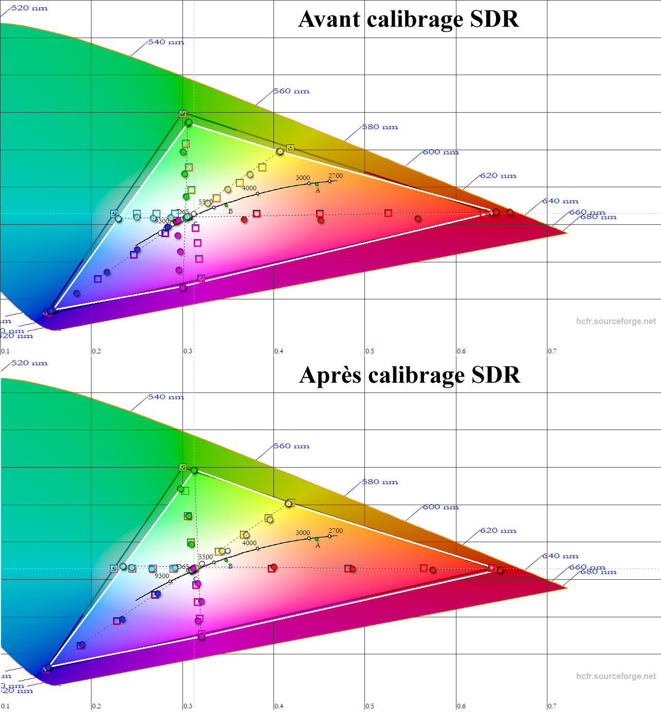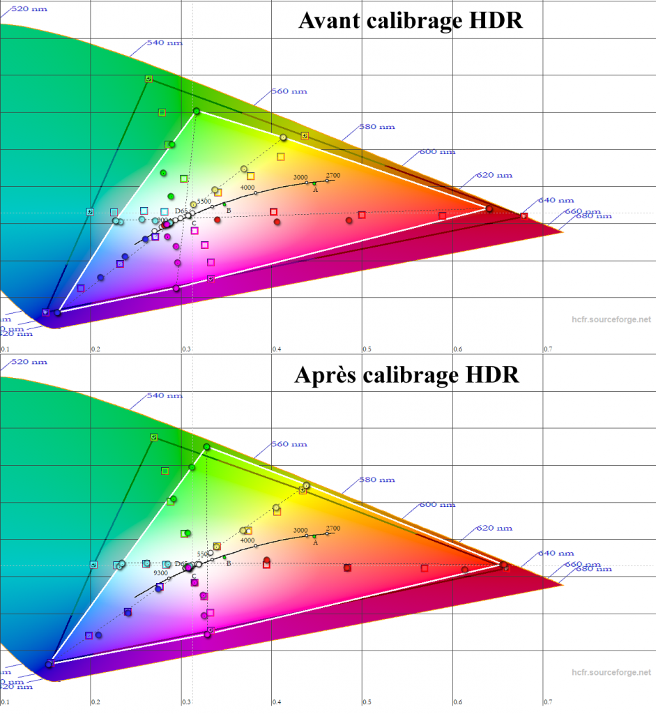 Avant calibrage HDR, le gamut n’est pas bon du tout. Aucun réglage n’a été fait lors du premier calibrage. Les menus des couleurs n’ont pas été modifiés.