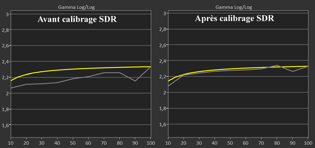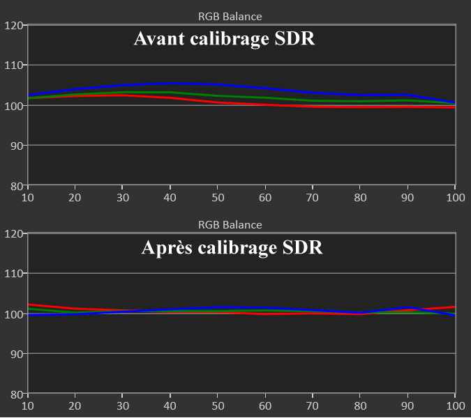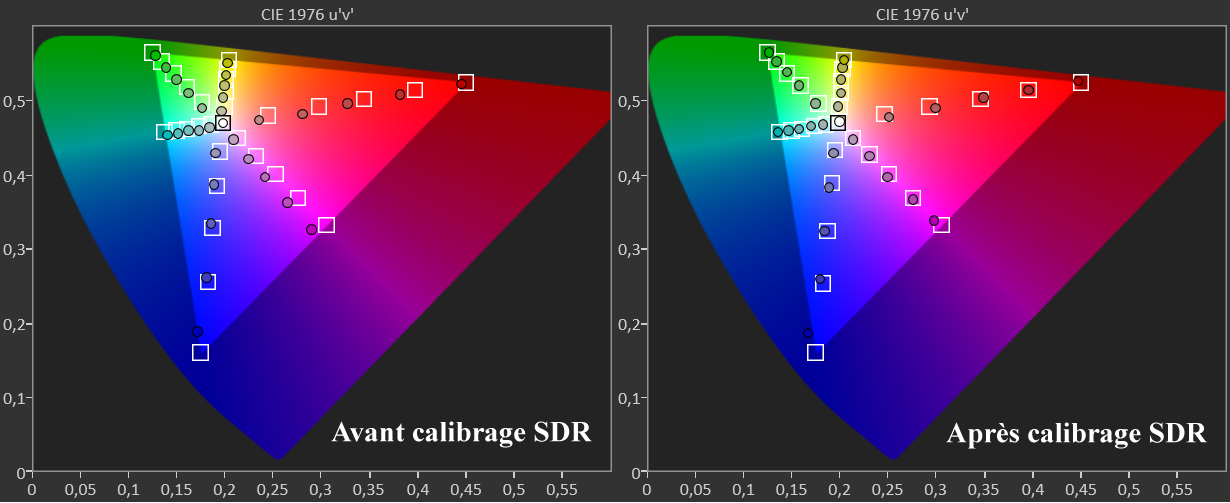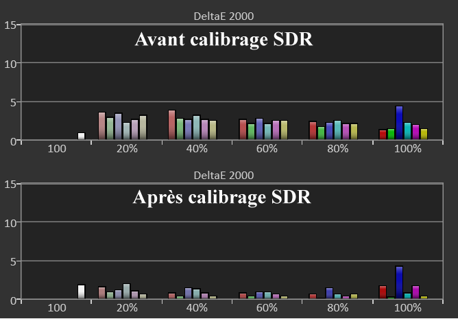 Après calibrage SDR : J’ai corrigé la balance des blancs pour atteindre un delta E moy de 1,4 (max 2,5). Le pic de luminance est fixé à 76 nits, en concordance avec les conditions de visionnage.