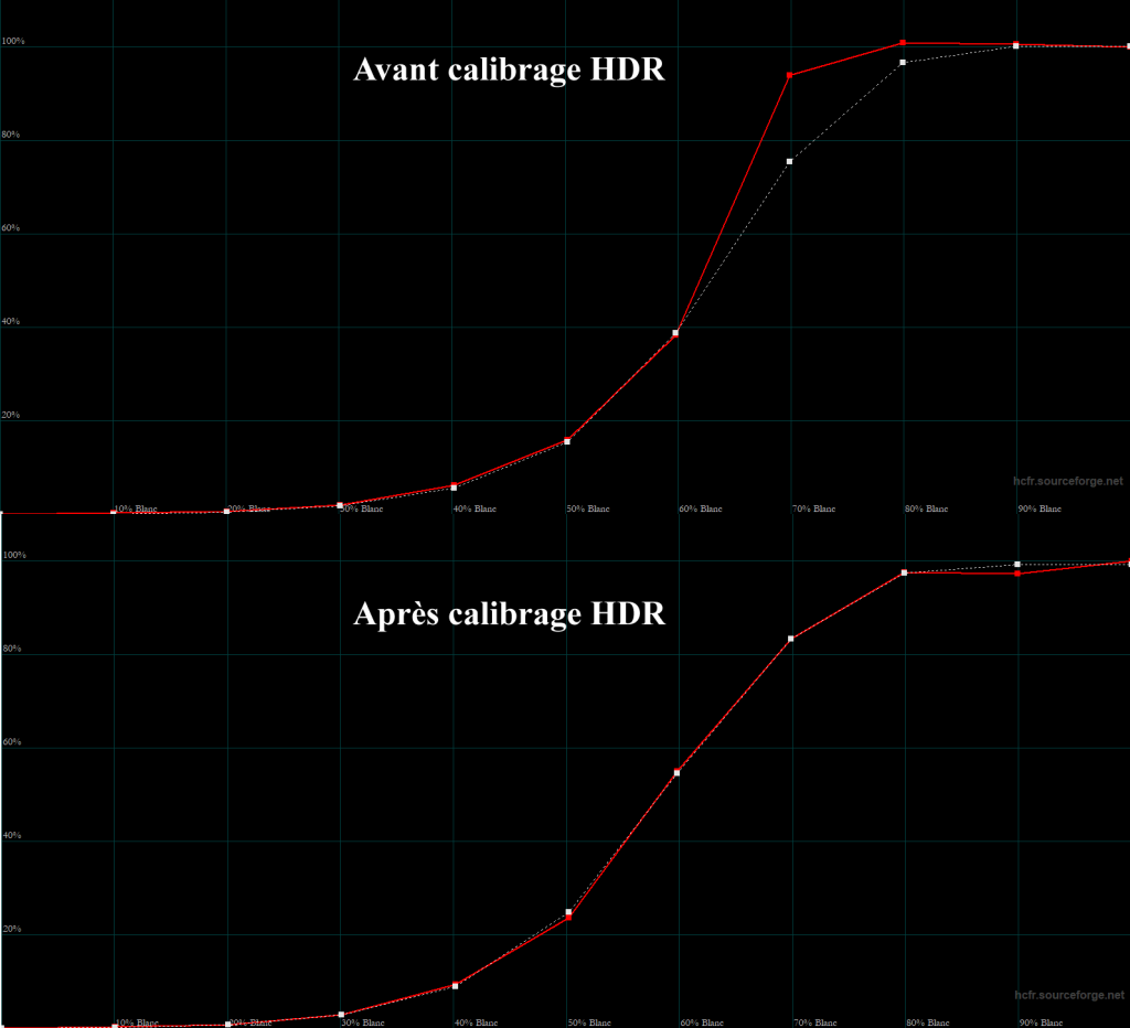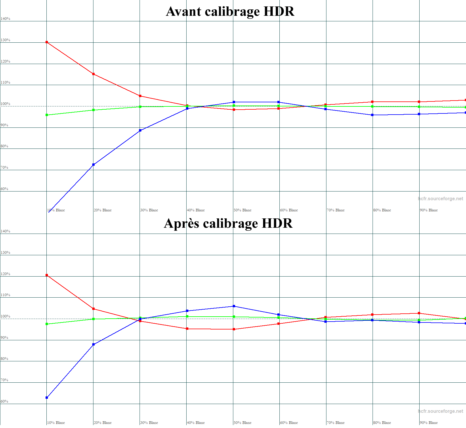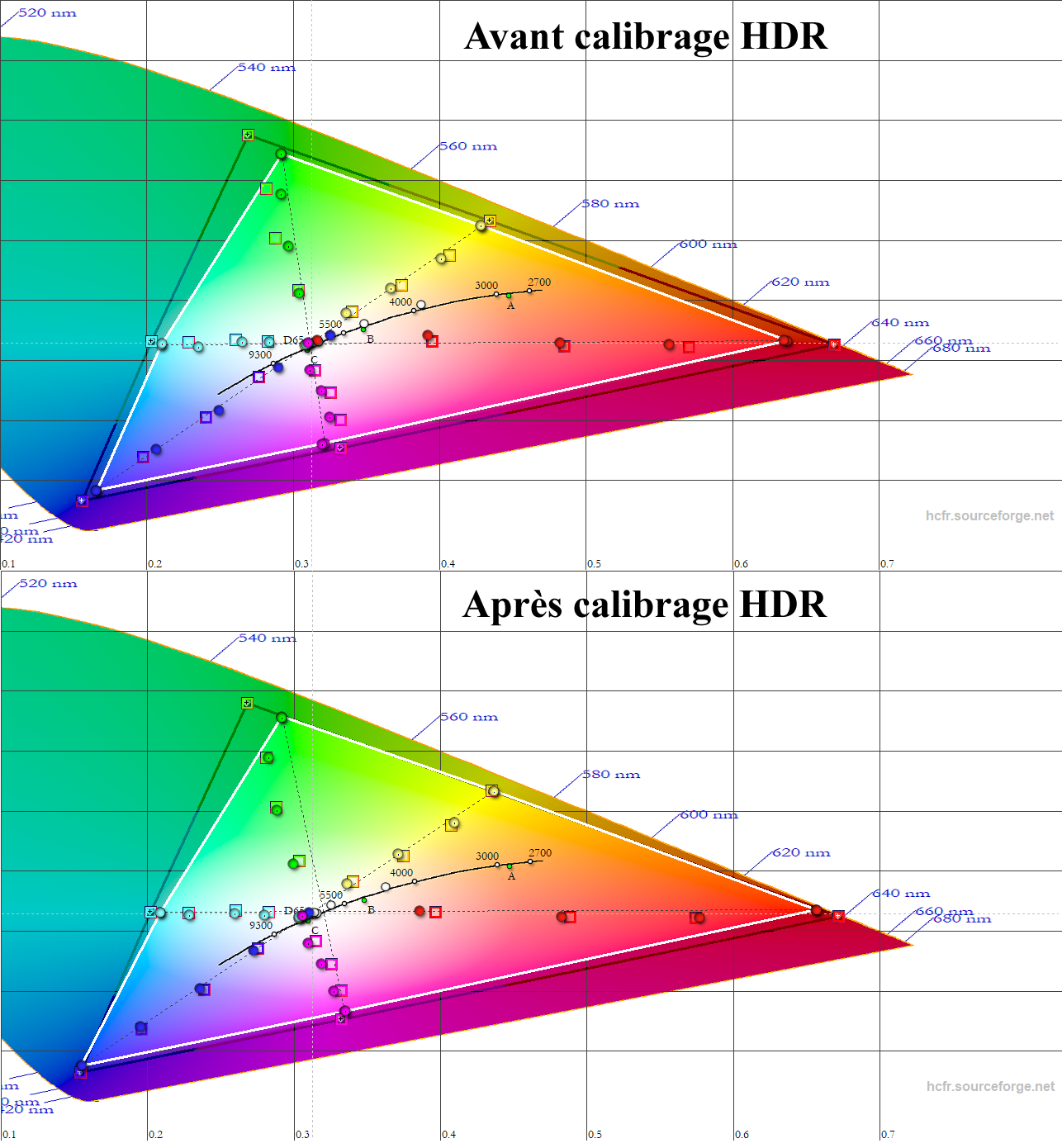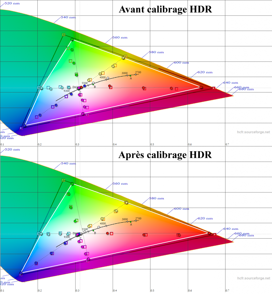 Avant calibrage HDR BT2020 dans l’espace DCI-P3, les couleurs présentent quelques défauts de saturations et manque un peu de couverture dans l’espace DCI-P3 (norme cinéma).