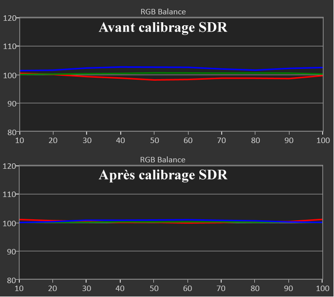 Avant calibrage HDR, la balance des blancs est aussi trop froide (manque de rouge), mais de peu avec un delta E moy à 2,1 (max 4,8).