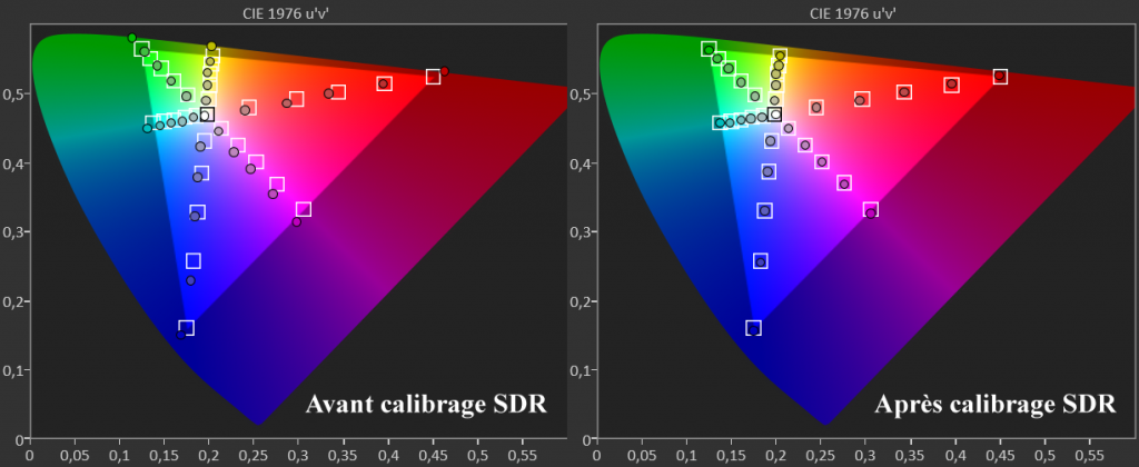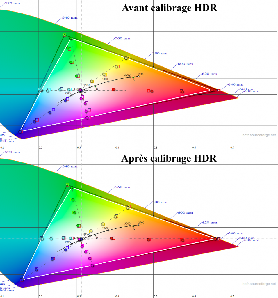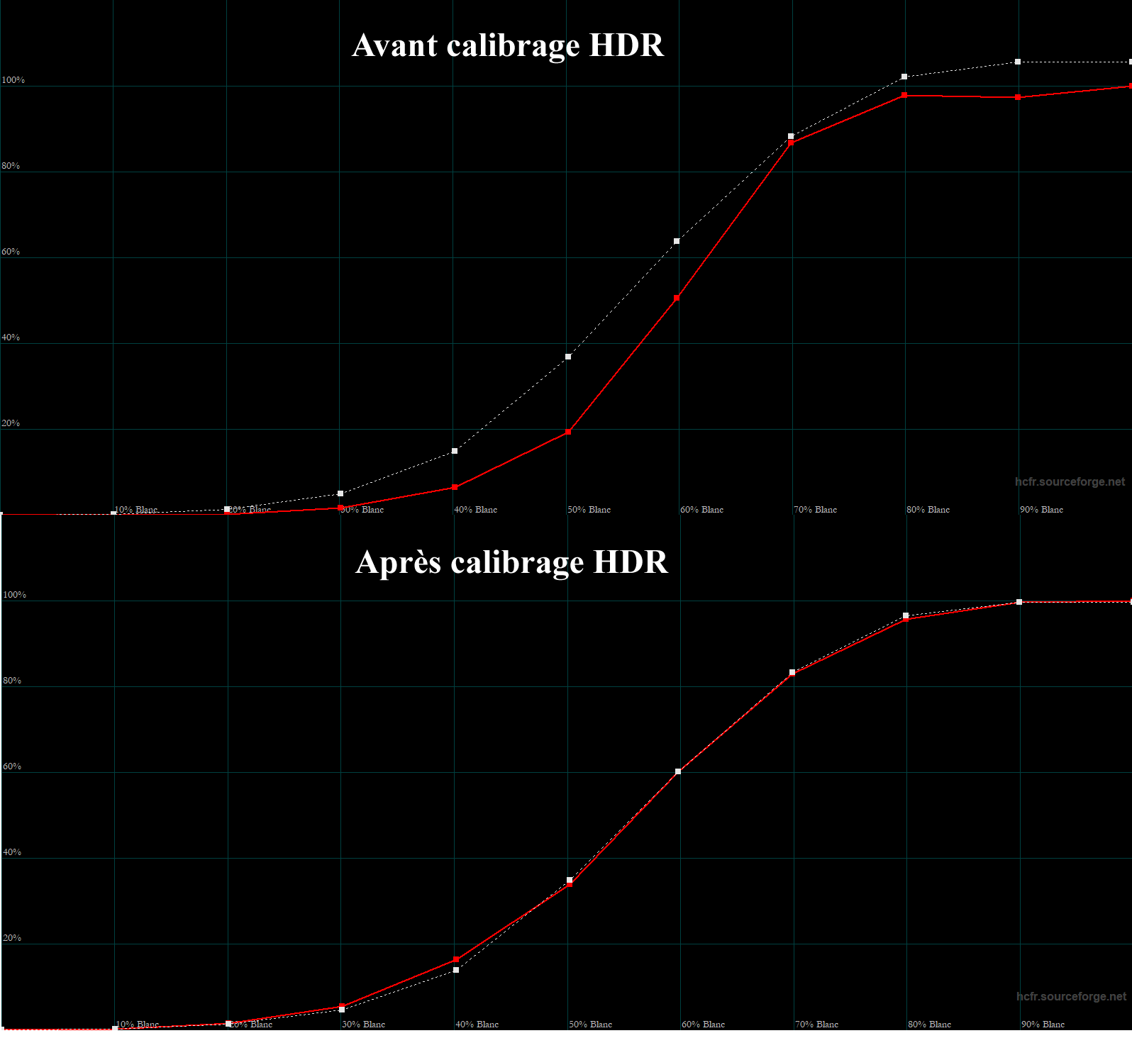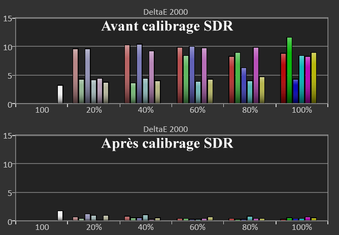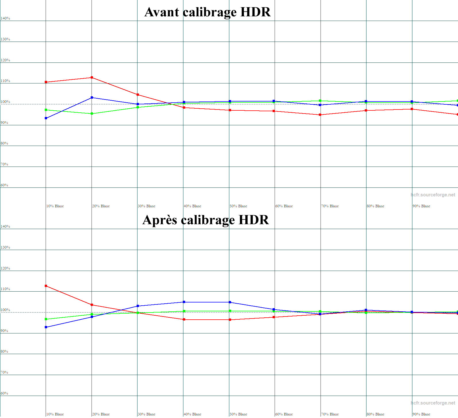 Après calibrage HDR, la correction de la balance des blancs donne un delta E moy à 1,2 (max 2,3). Le gros travail est surtout sur la courbe de luminance.
