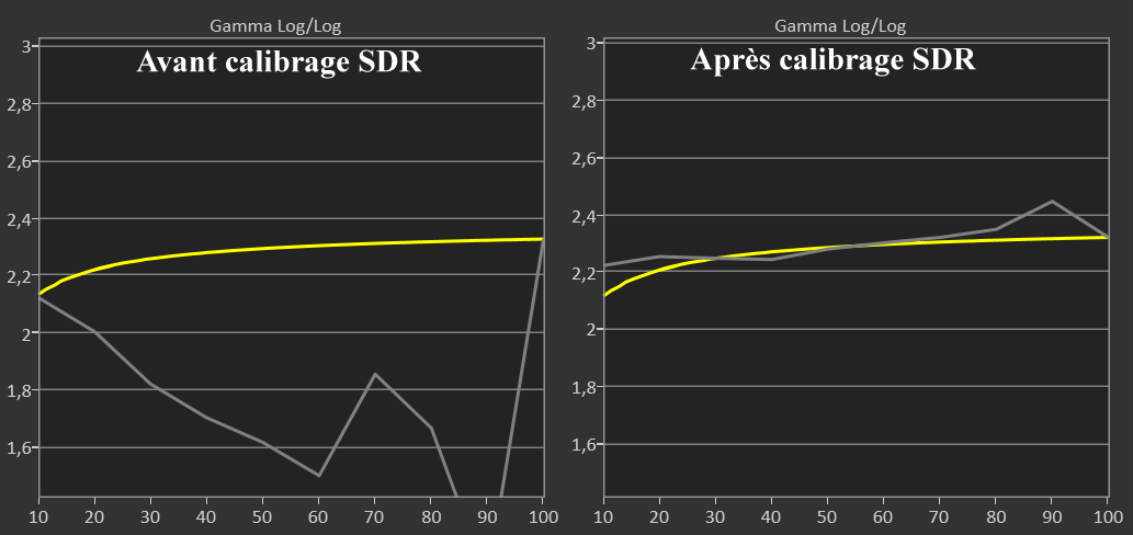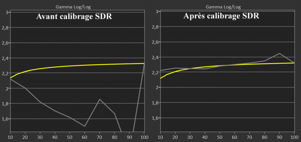 Après calibrage SDR, j’ai corrigé le gamma, très proche du BT1886, pour des images mieux contrastées. Plus de contraste dynamique que je conseille de laisser désactiver.