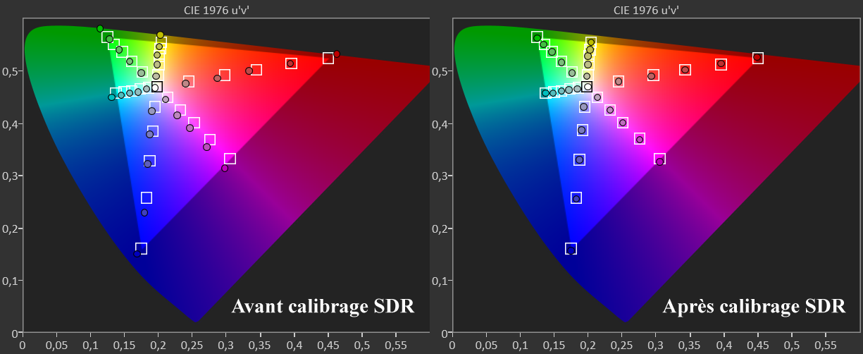 Après calibrage, j’obtiens de meilleurs résultats sur les couleurs. Le gamut BT709 de la norme SDR est bien respecté et bien couvert. Le delta E moyen tombe à 0,6 (max 1,7). Le ColorChecker donne aussi donne de bons résultats avec un delta E moy à 0,7 (max 1,3). Bonne fidélité.