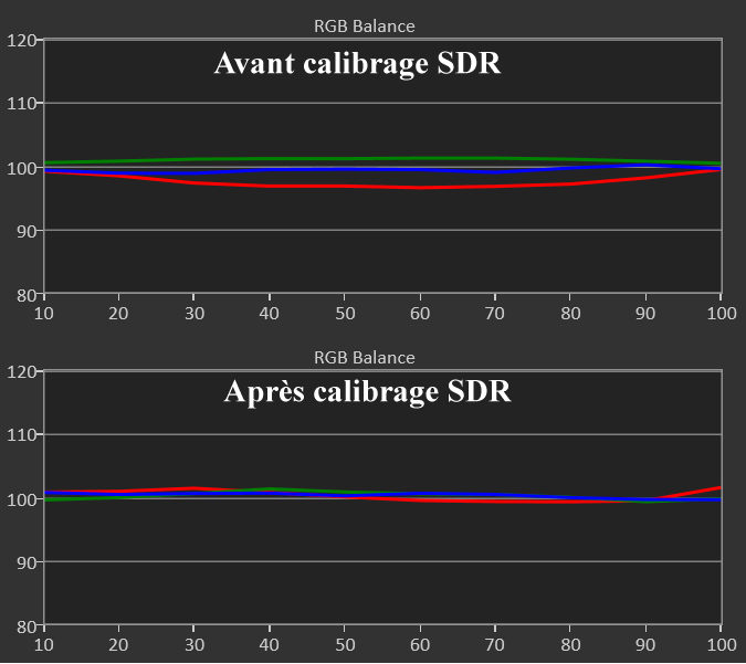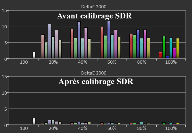 Après calibrage, la correction des couleurs est bonne avec presque 100% de couverture du DCI-P3. C’est plutôt rare. Le delta E moy descend à 1,1 attestant également des bonnes luminances.