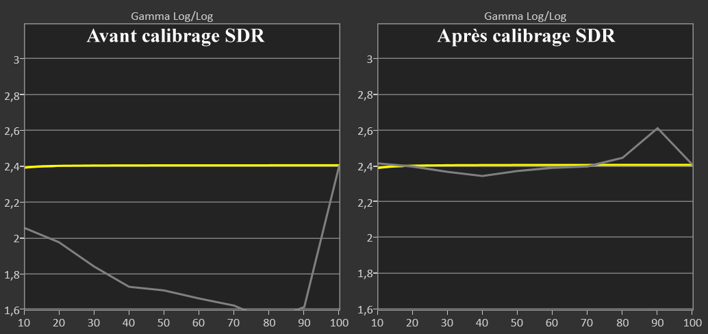 𝗔𝗽𝗿𝗲̀𝘀 𝗰𝗮𝗹𝗶𝗯𝗿𝗮𝗴𝗲 𝗦𝗗𝗥 : la balance des blancs n’a pas été simple car le rouge manque de linéarité. J’arrive quand même à obtenir un delta E moy à 1,7 (max 2,8). Je place le pic de luminance à 62 nits, toujours au-dessus de la recommandation pour garder du dynamisme à l’image.