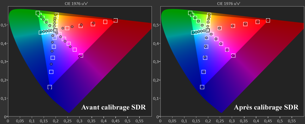 Après calibrage, les couleurs se corrigent très bien. Les saturations sont maintenant conformes avec une bonne couverture du BT709 (100%). Le delta E moy chute à 0,7 (max 1,5). Donc très bonne colorimétrie. Le ColorChecker donne un delta E moy à 0,8 (max 2,4), ce qui est bon pour la fidélité des images.