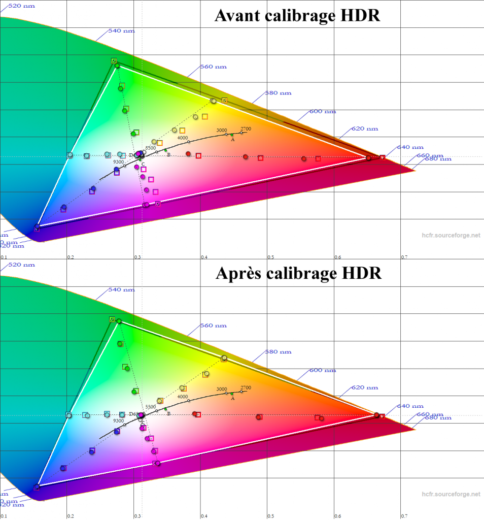 Avant calibrage HDR, les couleurs présentent déjà une bonne couverture du gamut DCI-P3, une couverture supérieure à d’autres 5000ES. Il y a quelques défauts de saturations et teintes donnant un delta E moy à 3,2.