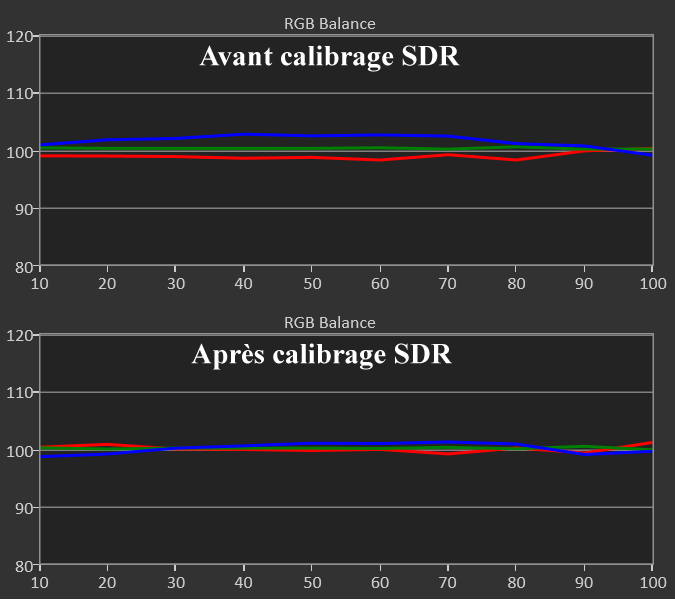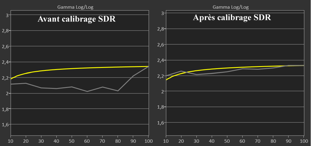 Avant calibrage SDR, la balance des blancs est trop froide (excès de bleu). Son delta E moy est à 3,4 avec un max à 5,5. On ne souhaite pas dépasser 2. Le pic de luminance atteint 89 nits ce qui est trop élevé pour le SDR. Les surfaces blanches de la pièce peuvent pénaliser le contraste.