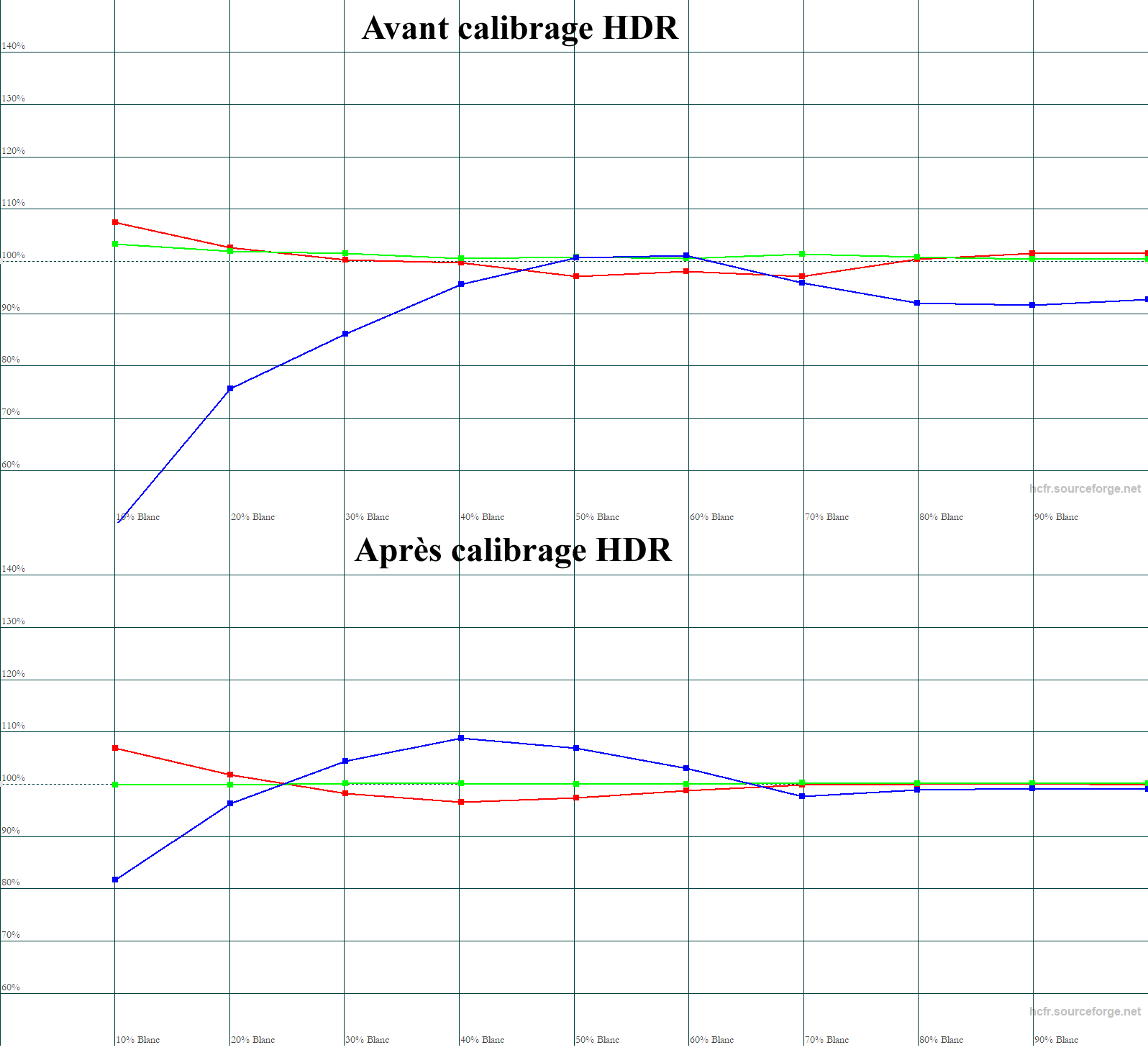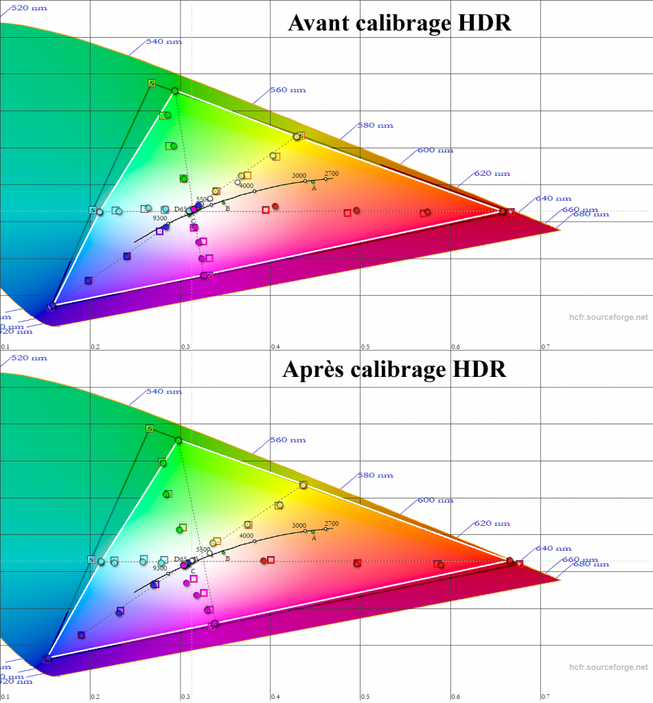 Après calibrage SDR : J’ai corrigé la balance des blancs pour atteindre un delta E moy à 1,6 (max 3). Le pic de luminance est descendu à environ 60 nits, toujours au-dessus de la recommandation pour une image un peu plus dynamique.