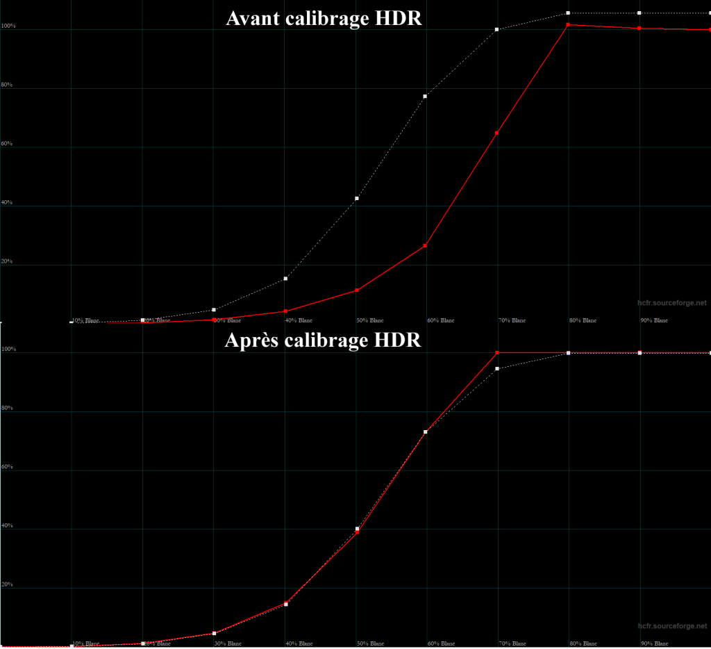 Après calibrage HDR, le delta E moy de la balance des blancs descend à 1,4 (max 3) avec un pic de luminance à 93 nits. En ne travaillant que sur le VP, j’arrive à améliorer la luminance du 50% pour monter à 23 nits. C’est déjà une assez bonne valeur. Mais en exploitant le mapping HDR du lecteur Panasonic 820, j’obtiens bien mieux, avec 36 nits pour le 50% blanc. Les basses lumières sont relevées pour de meilleurs détails. Et les hautes lumières sont bien détaillées également.