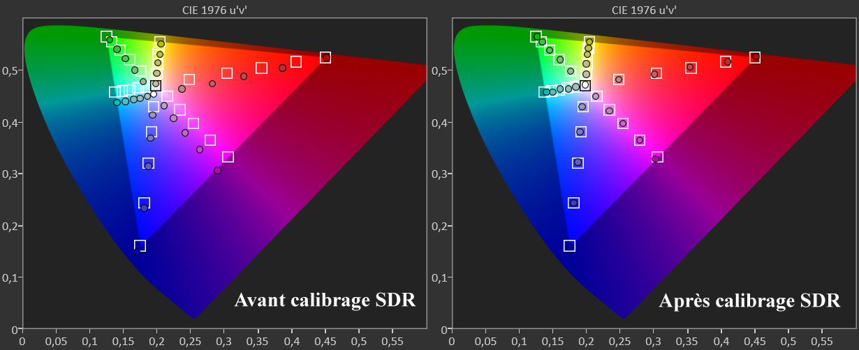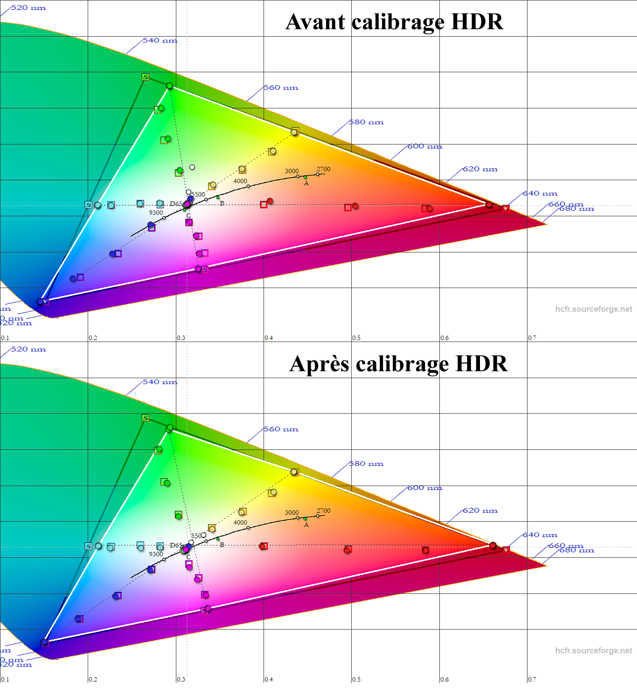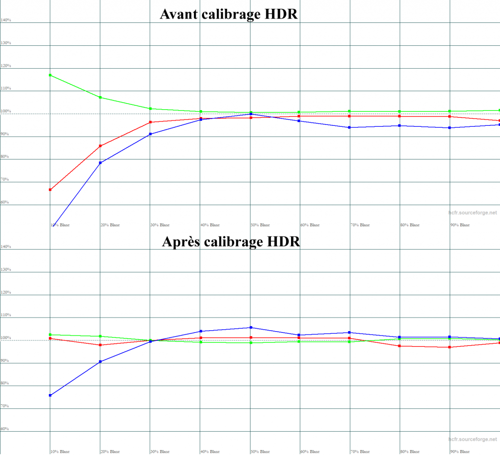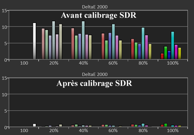Après calibrage, j’ai ajusté la balance des blancs spécifiquement au HDR pour obtenir un delta E moy à 1,7 (max 3). Le bleu a une réponse légèrement en cloche.
