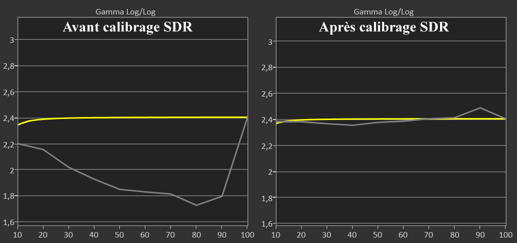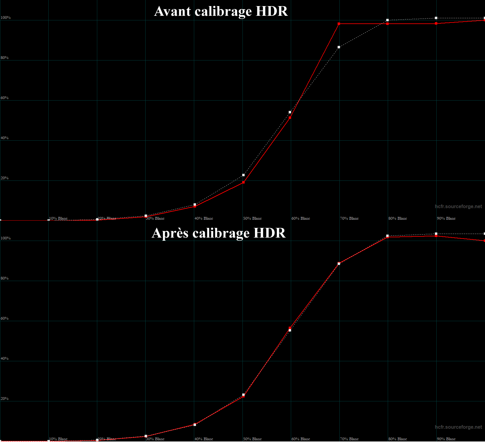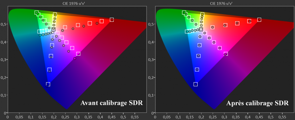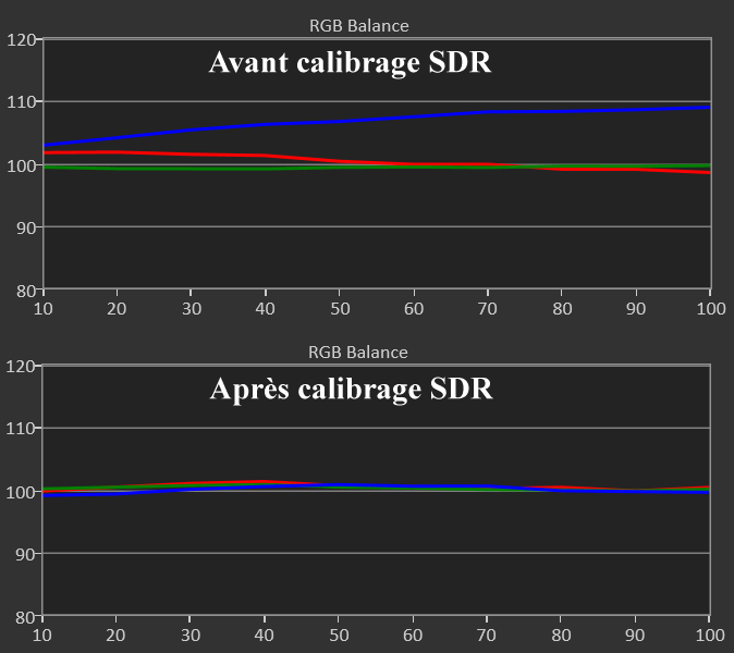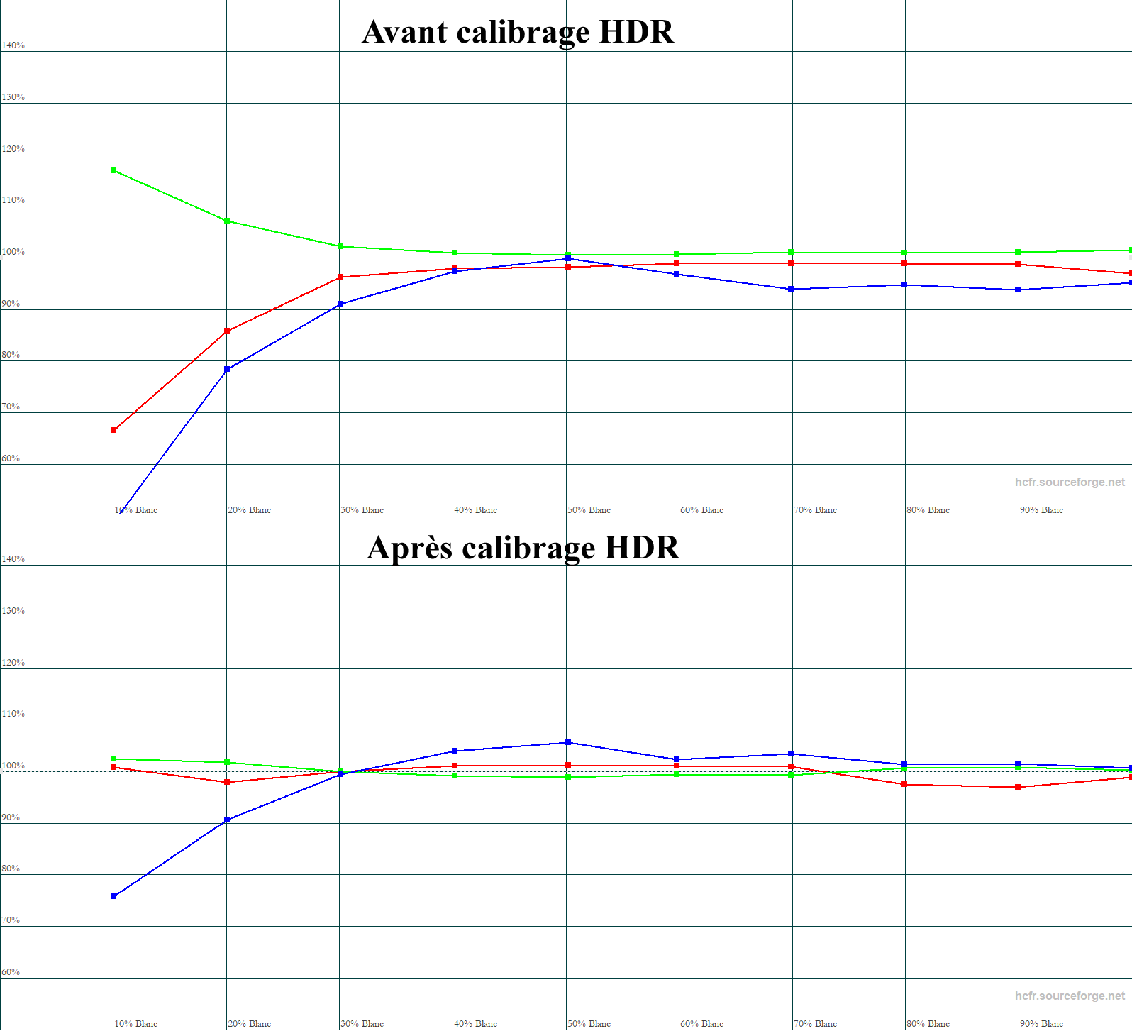 Après calibrage, j’ai ajusté la balance des blancs spécifiquement au HDR pour obtenir un delta E moy à 1,7 (max 3). Le bleu a une réponse légèrement en cloche.