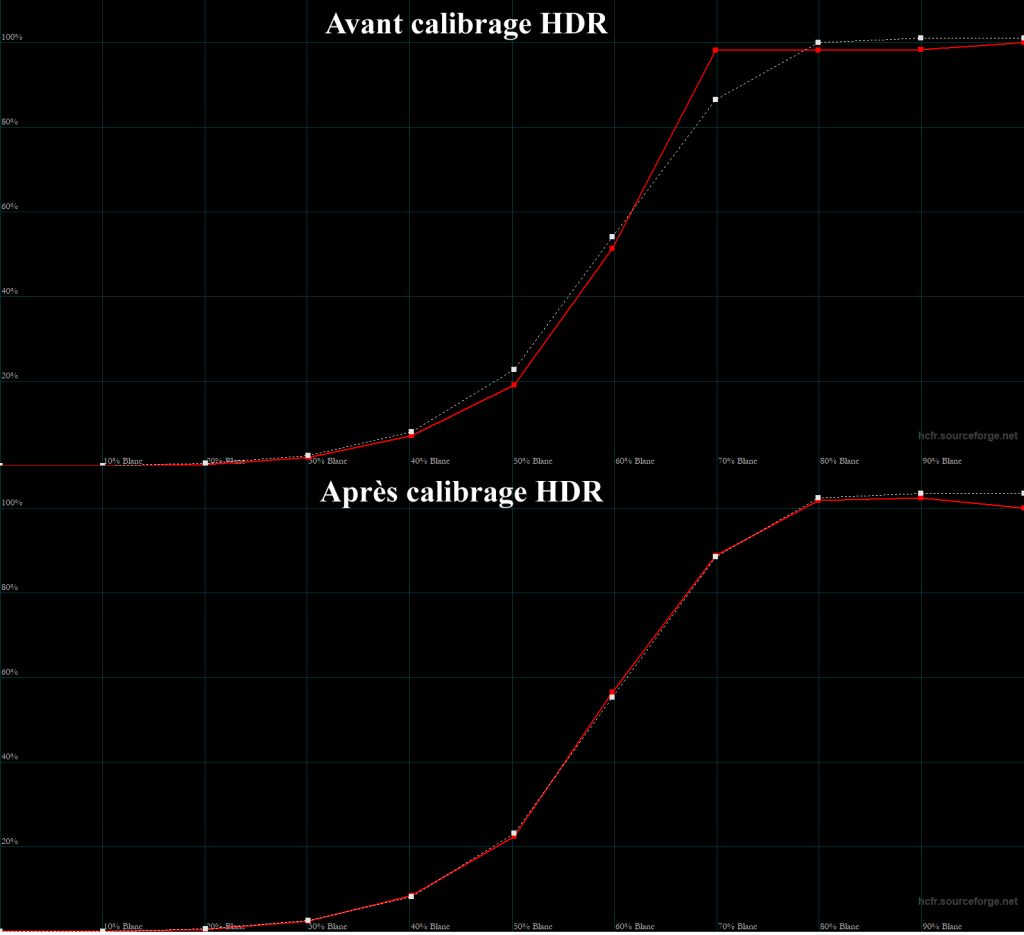 Avant calibrage HDR : Pour faire les mesures, on bénéficie déjà de la correction du blanc que j’ai effectué pour le SDR. La balance des blancs est donc déjà pas mal en termes de colorimétrie. On est plus proche du D65 avec un delta E moy à 3 (max 5,4). Mais en termes de luminance, on est à l’ouest. Les noirs sont bouchés et les blancs sont brûlés.