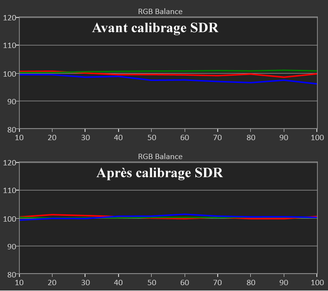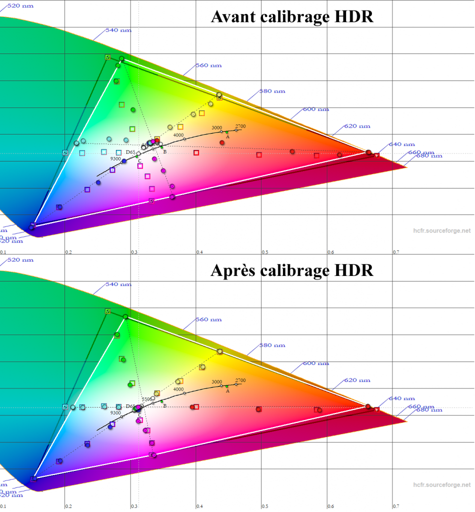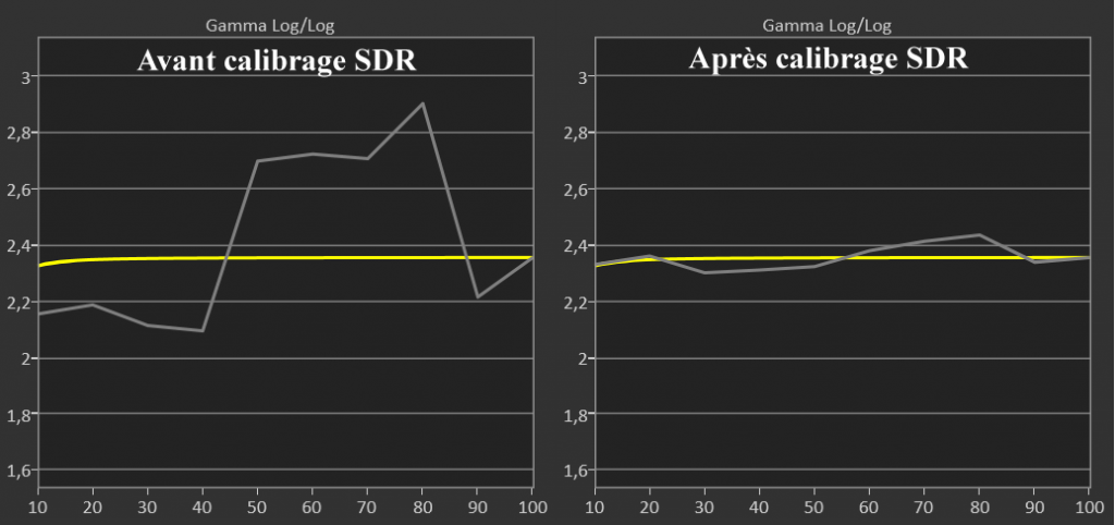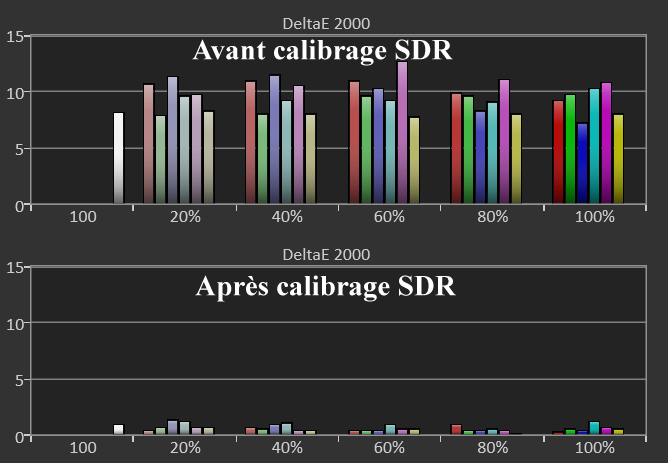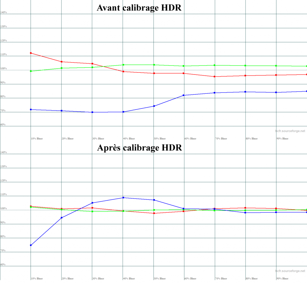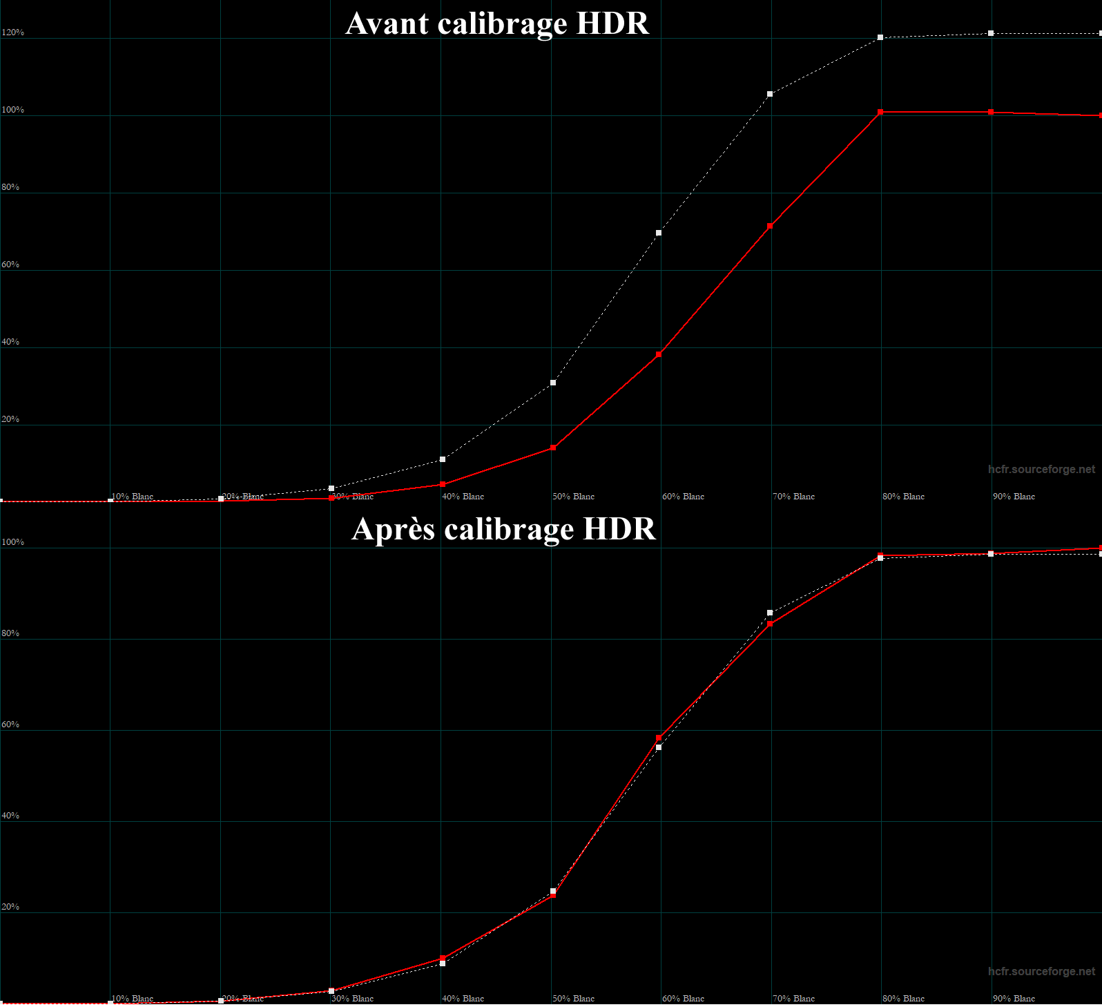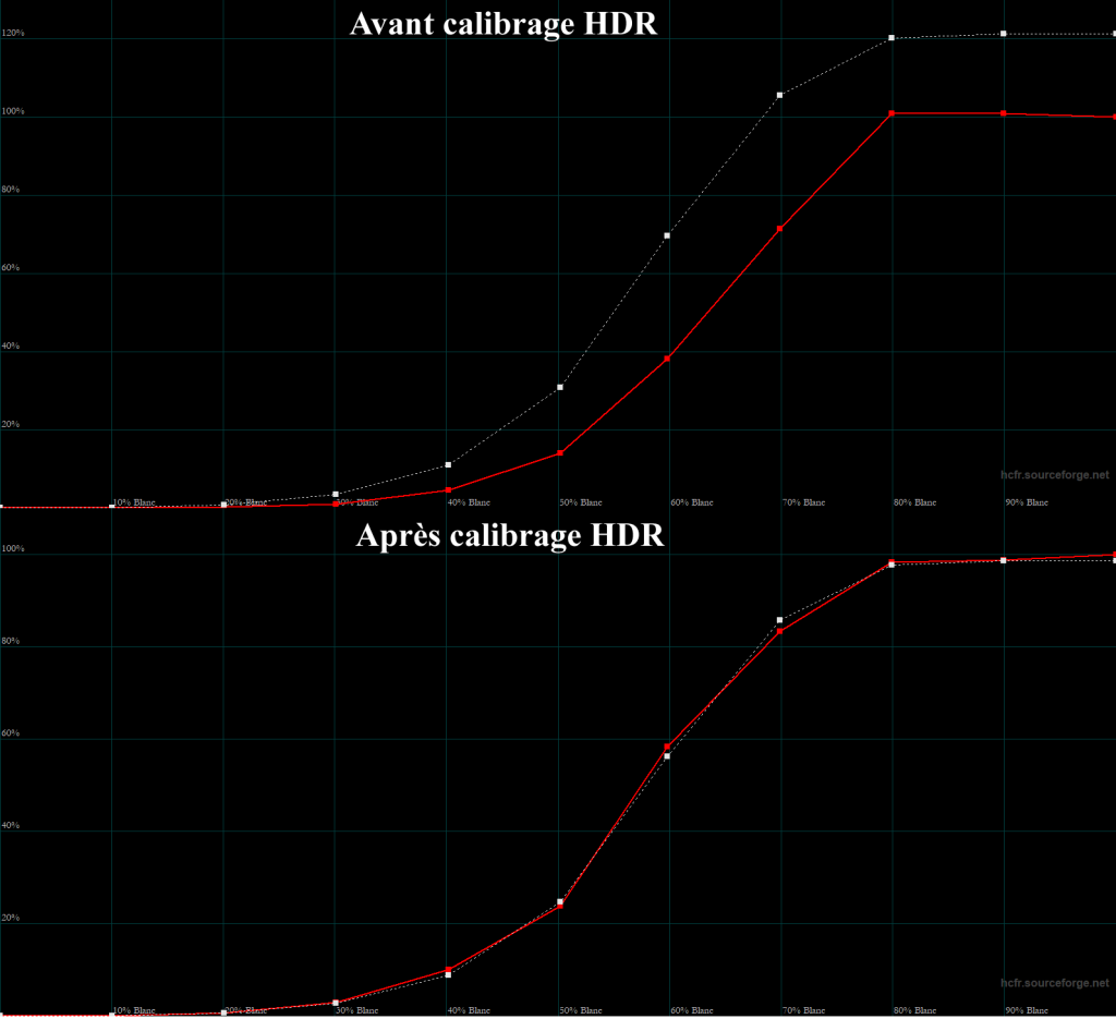 Après calibrage HDR, j’ai pu descendre le delta E moy du blanc à 1,4 (max 2,7). C’est toujours plus compliqué en HDR. On touche aux limites techniques des appareils. Le pic monte à 95 nits ce qui est bon pour le HDR. Le 50% blanc monte à 23 nits pour une meilleure visibilité dans les scènes sombres. On pourrait encore monter le 50%, mais les blancs commenceraient à être brûlés. On est à la limite.