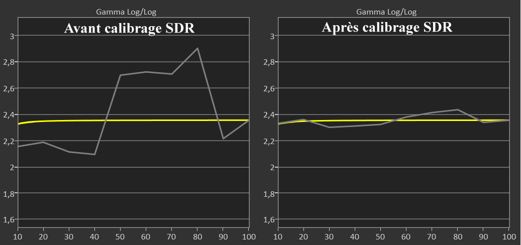 Après calibrage, le pic monte à 95 nits ce qui est bon pour le HDR. Le 50% blanc monte à 23 nits pour une meilleure visibilité dans les scènes sombres. La courbe de luminance mesurée suit la courbe théorique.