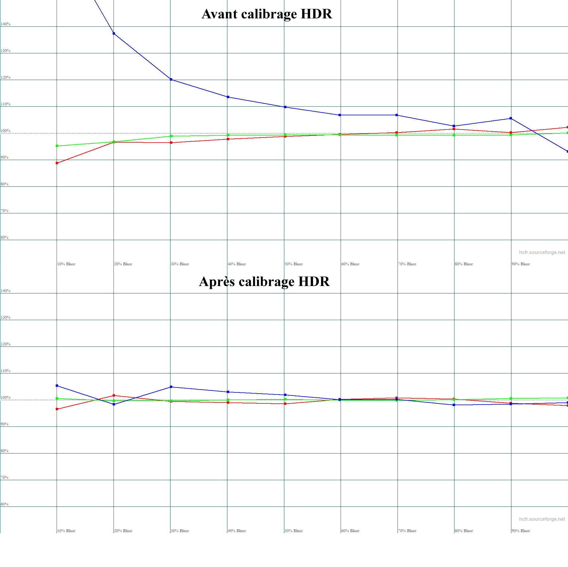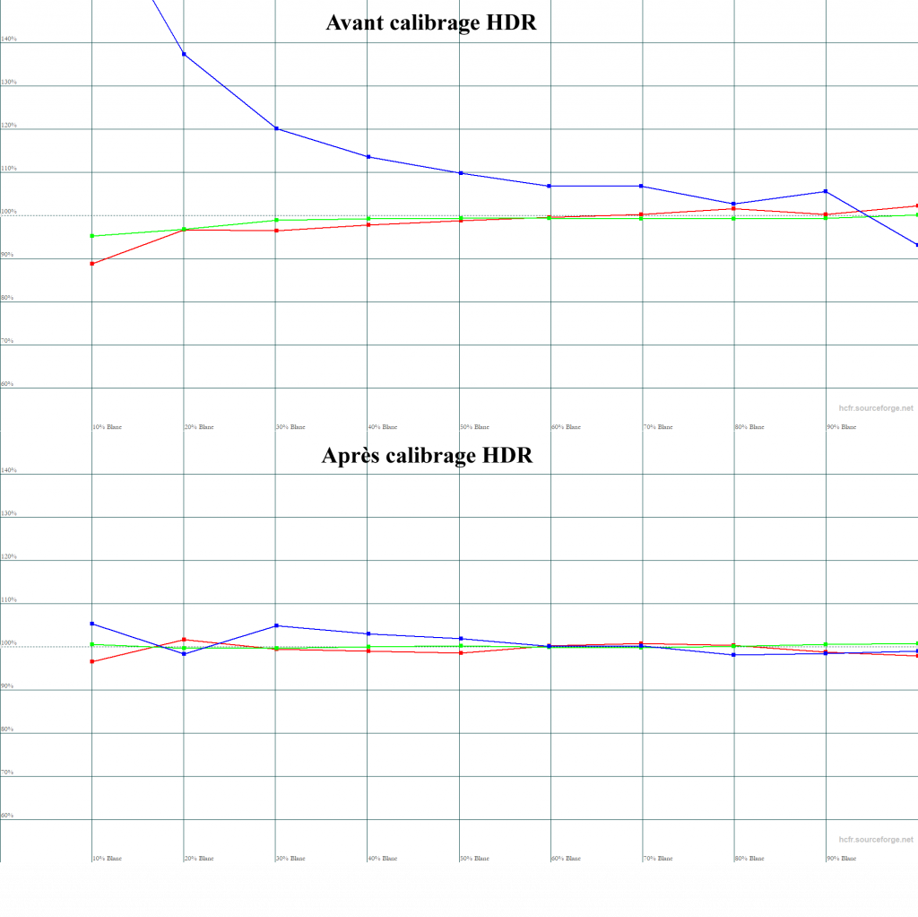 Après calibrage HDR, le delta E moy de la balance des blancs descend à 0,9 avec un pic de luminance à 180 nits. On est largement au-dessus des 100 nits recherchés pour obtenir un semblant de HDR qui, rappelle-on le, est initialement prévu pour les TV qui sont bien plus lumineuses. 180 nits assurent un « très bon » rendu HDR (en vidéoprojection). Le 50% est à 38 nits, ce qui est encore mieux pour ne pas avoir les scènes sombres trop sombres.