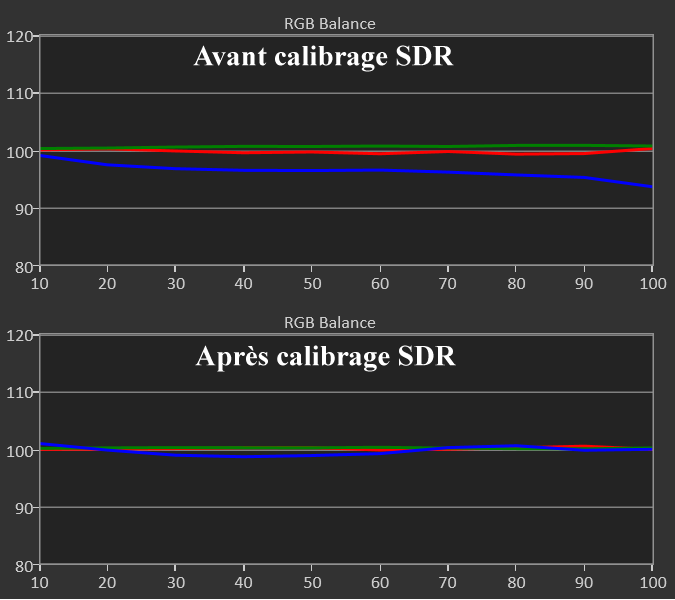 Après calibrage SDR : j’ai corrigé la balance des blancs pour atteindre un delta E moy de 1,3. J’ai descendu le pic de luminance à 67 nits, au-dessus de la recommandation pour toujours profiter d’une image dynamique.