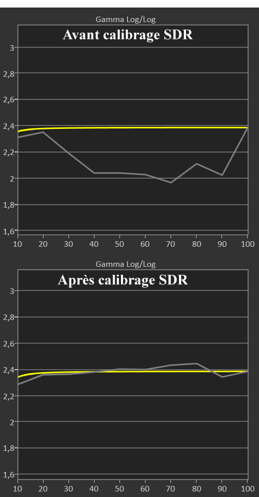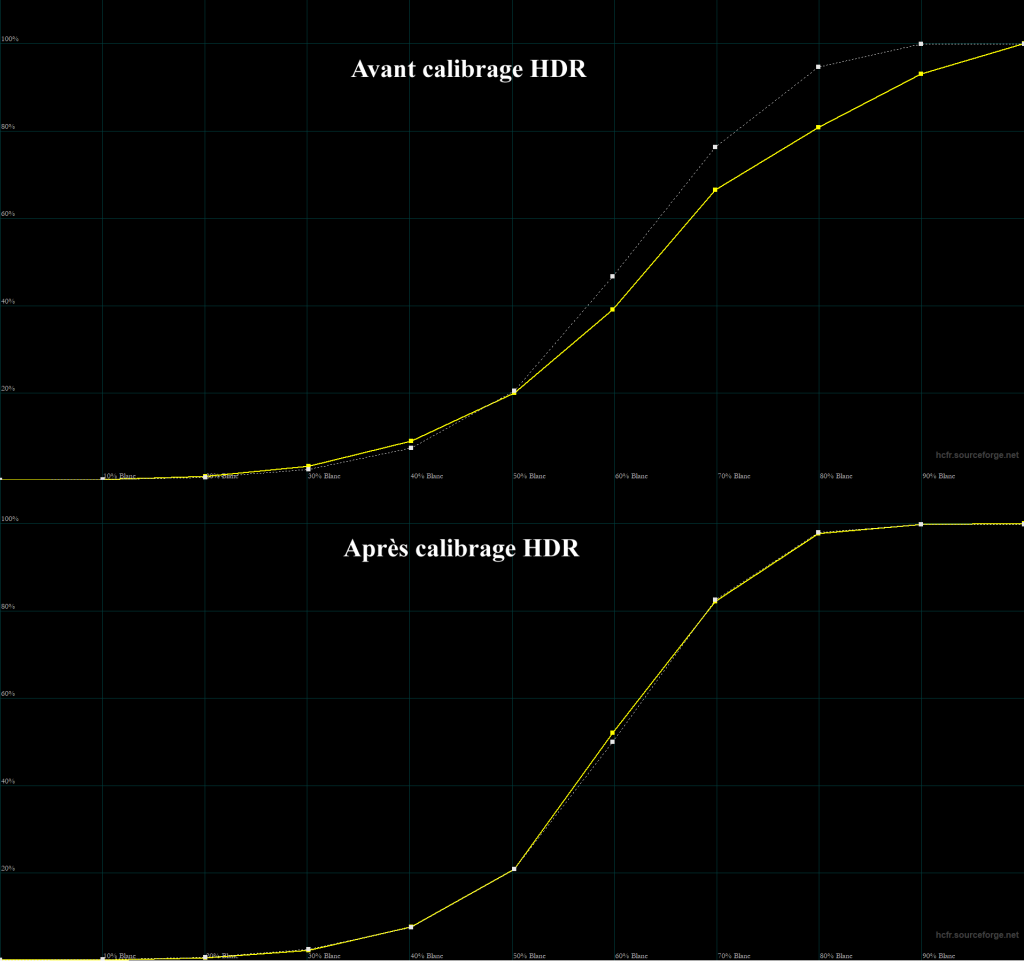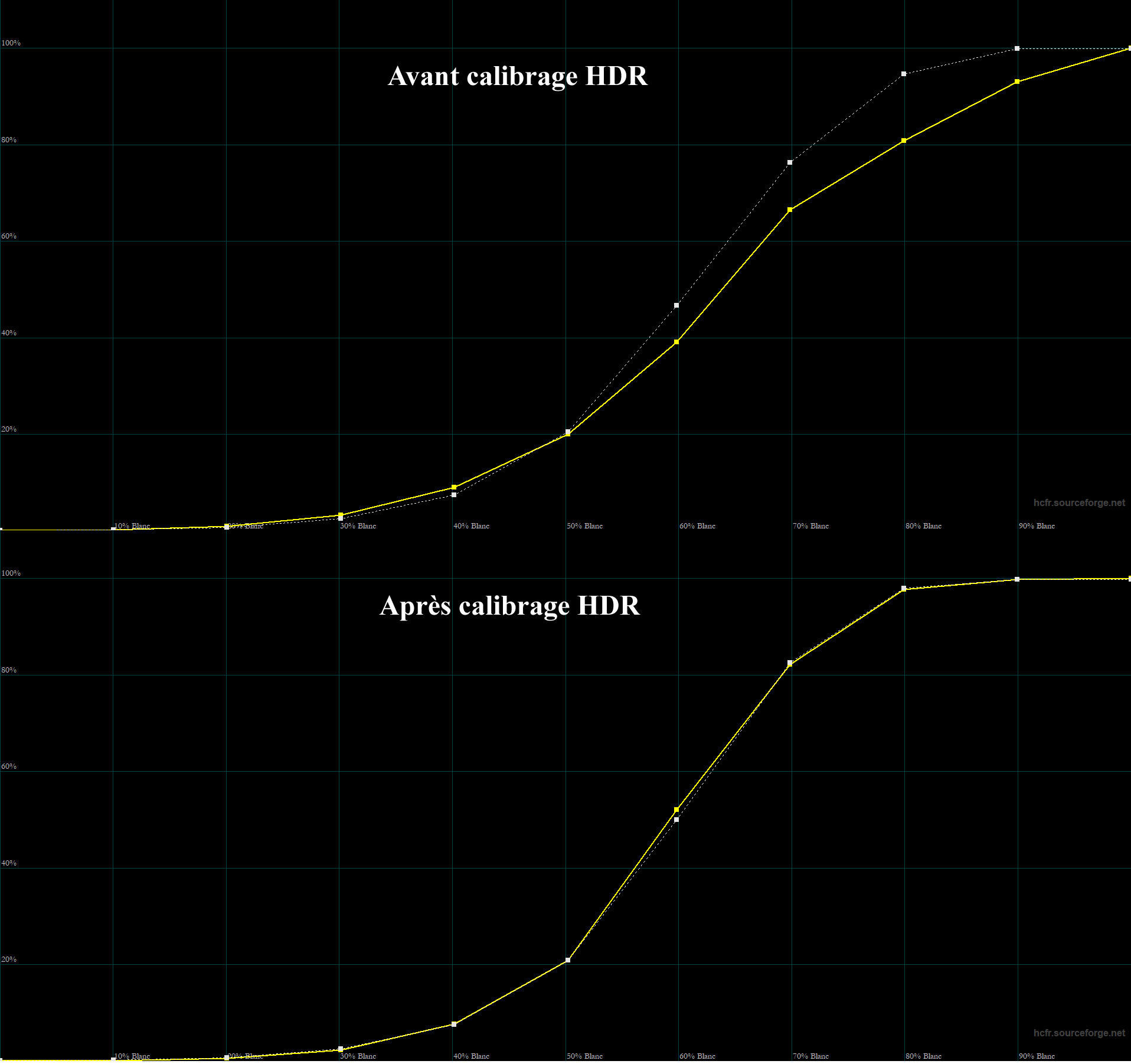 Après calibrage HDR, la courbe de luminance colle désormais très bien à la courbe théorique.