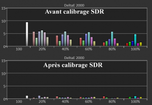 Avant calibrage HDR, les couleurs ne couvrent pas une plage colorimétrique suffisamment étendue et présentent des défauts de saturations et de teintes. Les delta E moy de chaque couleurs dépasse largement 2.